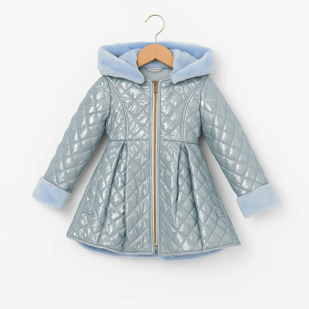 Cappottino trapuntato in tonalità ghiaccio effetto metallizzato, con linea svasata e pieghe che donano volume. Il cappuccio e i polsini sono rifiniti in morbida pelliccia ecologica celeste, creando un contrasto delicato. Chiusura frontale con zip dorata. Un modello caldo, luminoso e raffinato, ideale per un look elegante nelle giornate fredde.