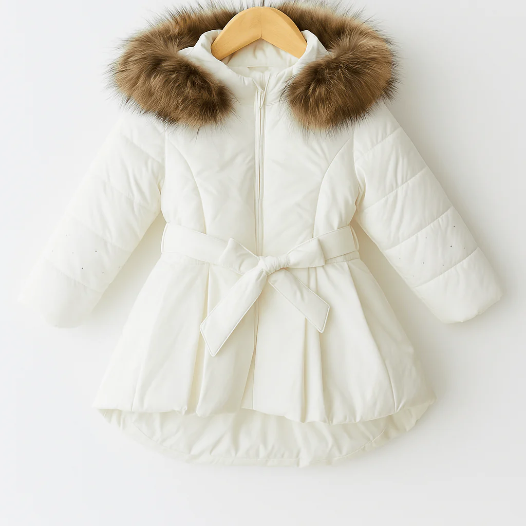 Piumino bianco dalla linea svasata, impreziosito da un cappuccio con morbida ecopelliccia color miele. La cintura in vita con fiocco definisce la silhouette, mentre le cuciture sagomate e le leggere trapuntature donano struttura ed eleganza. Chiusura con zip frontale. Un modello caldo e raffinato, perfetto per un look luminoso nelle giornate fredde.