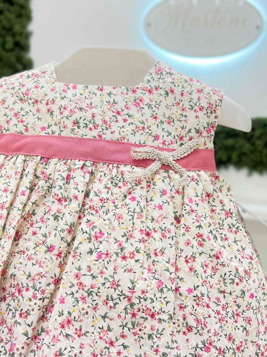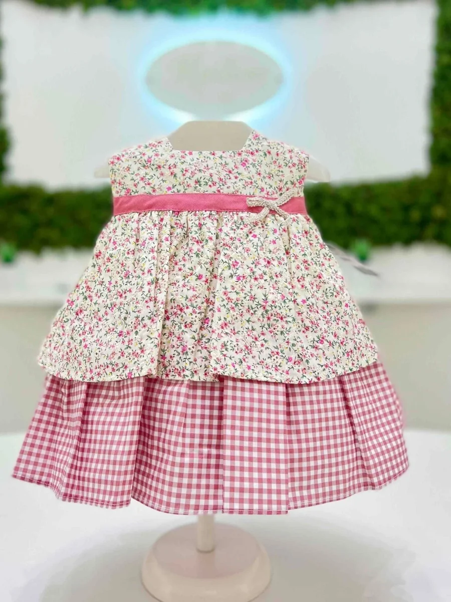 Vestitino neonata con balza e coulotte vichy in cotone e fantasia floreale.