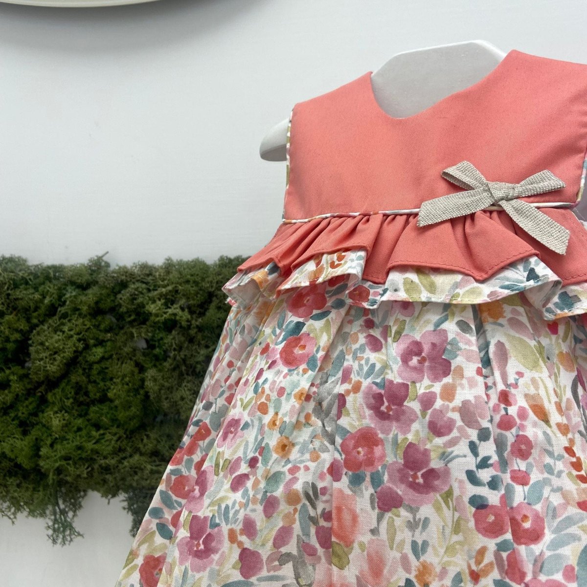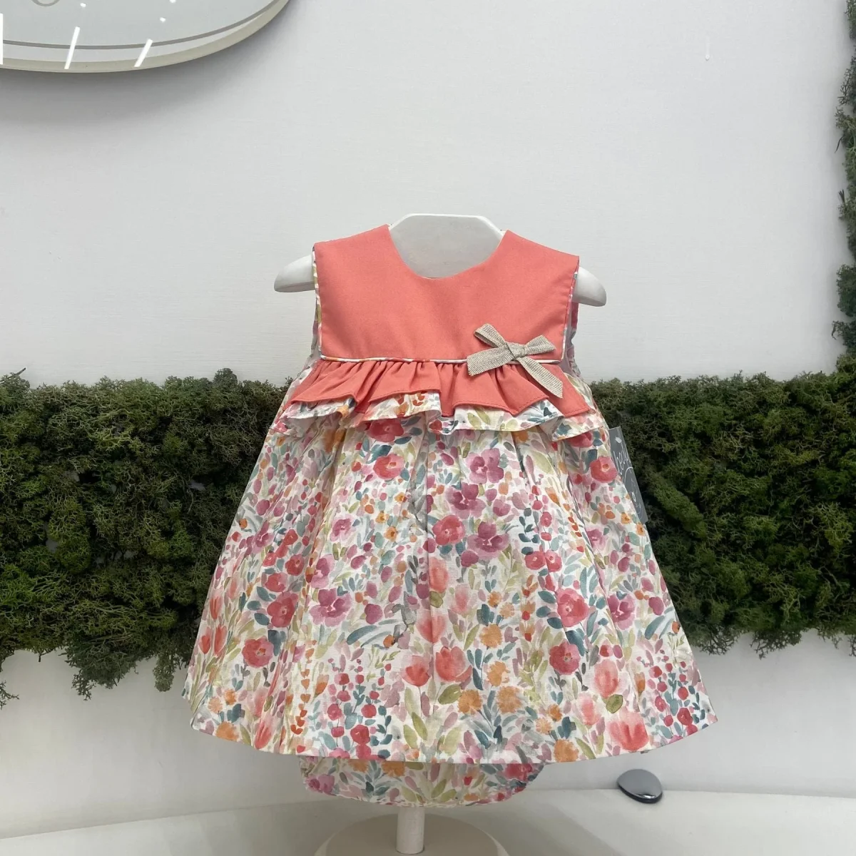 Abitino con culotte con fantasia a fiori e fiocco.