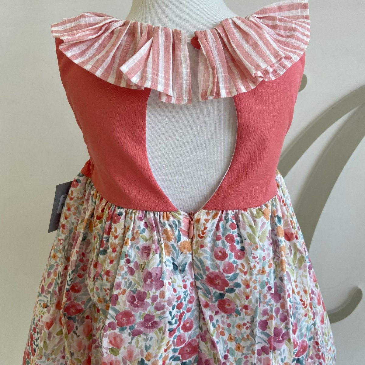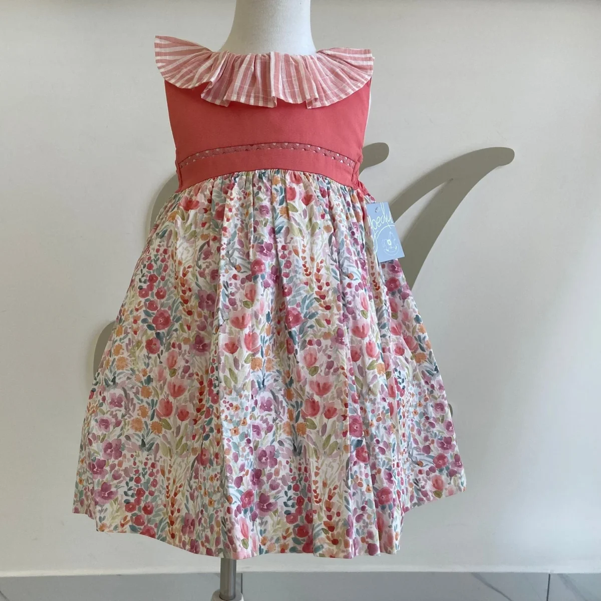 Abito con fantasia a fiori e corpetto tinta unita con collo con rouches a righe.