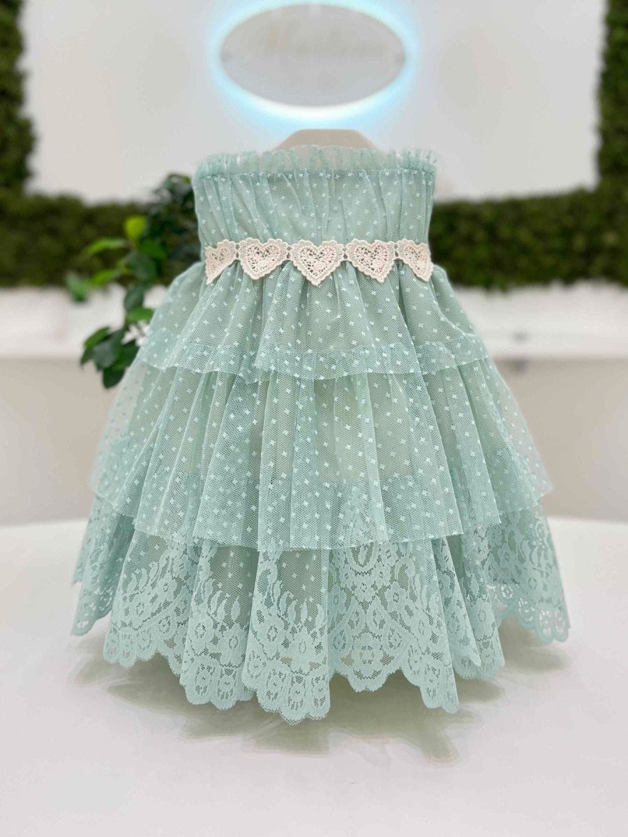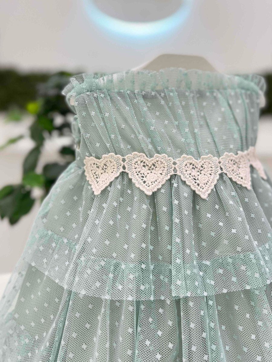 Abito bimba in tulle ricamato a balze con applicazioni in macramè.