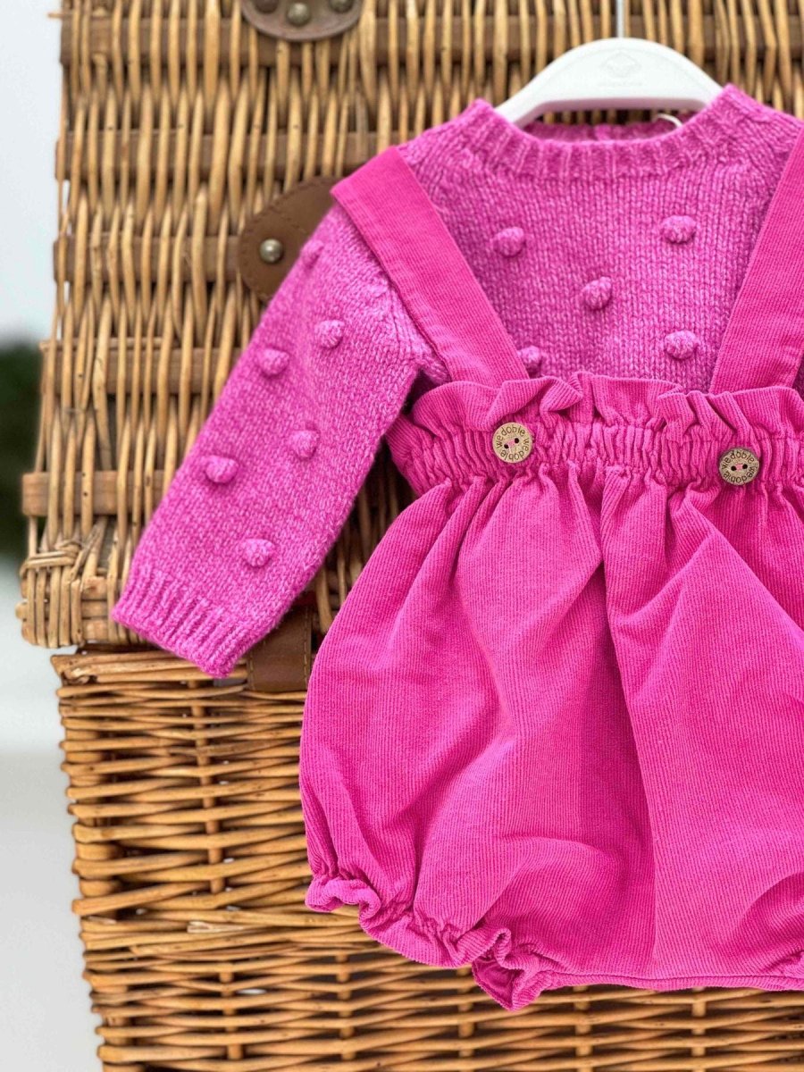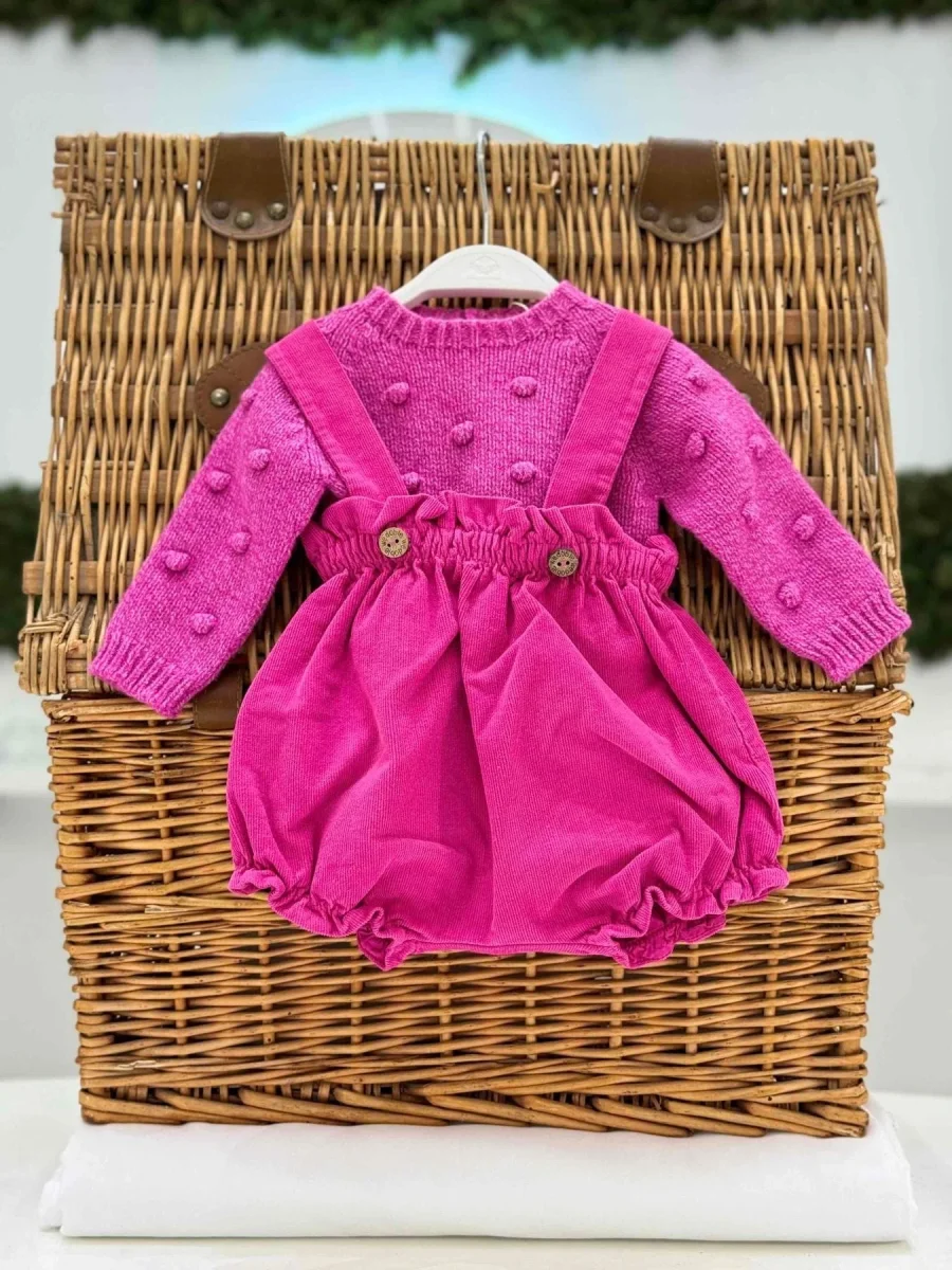 Completo salopette corta fucsia in velluto con maglione fucsia in lana e cashmere