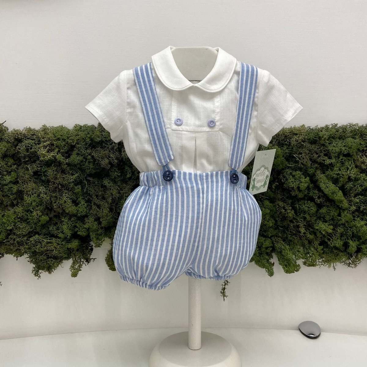 Completo con salopette a righe.