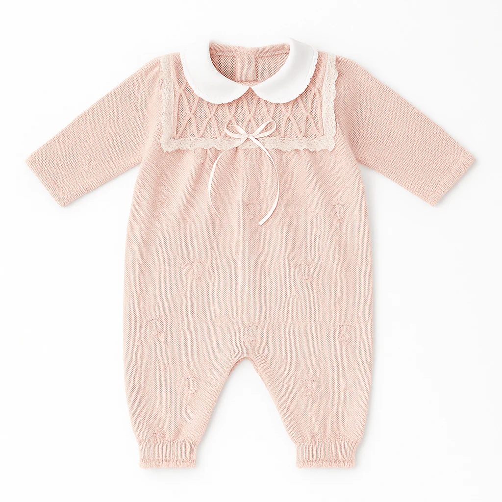 Tutina in maglia rosa con colletto bianco e inserto lavorato a rombi, rifinito da pizzo e fiocco centrale. Eleganza delicata.