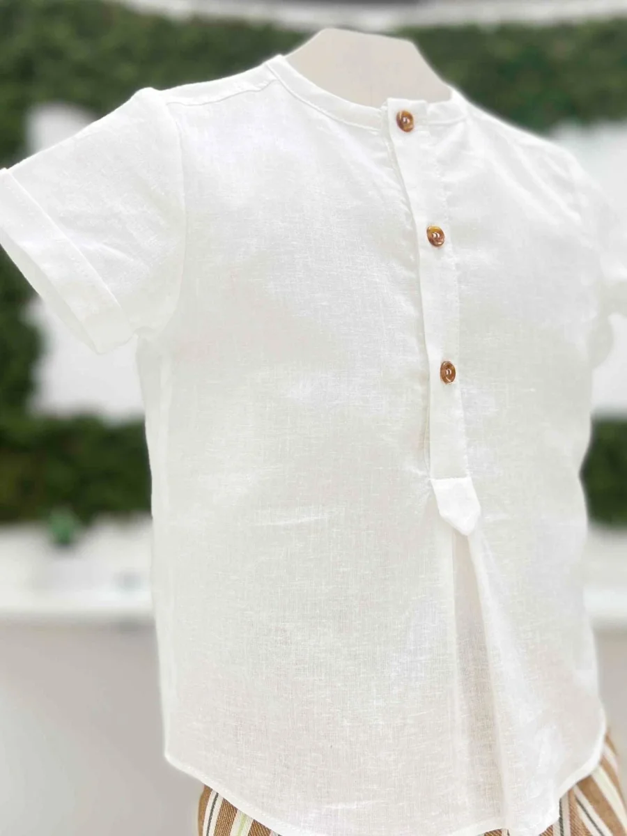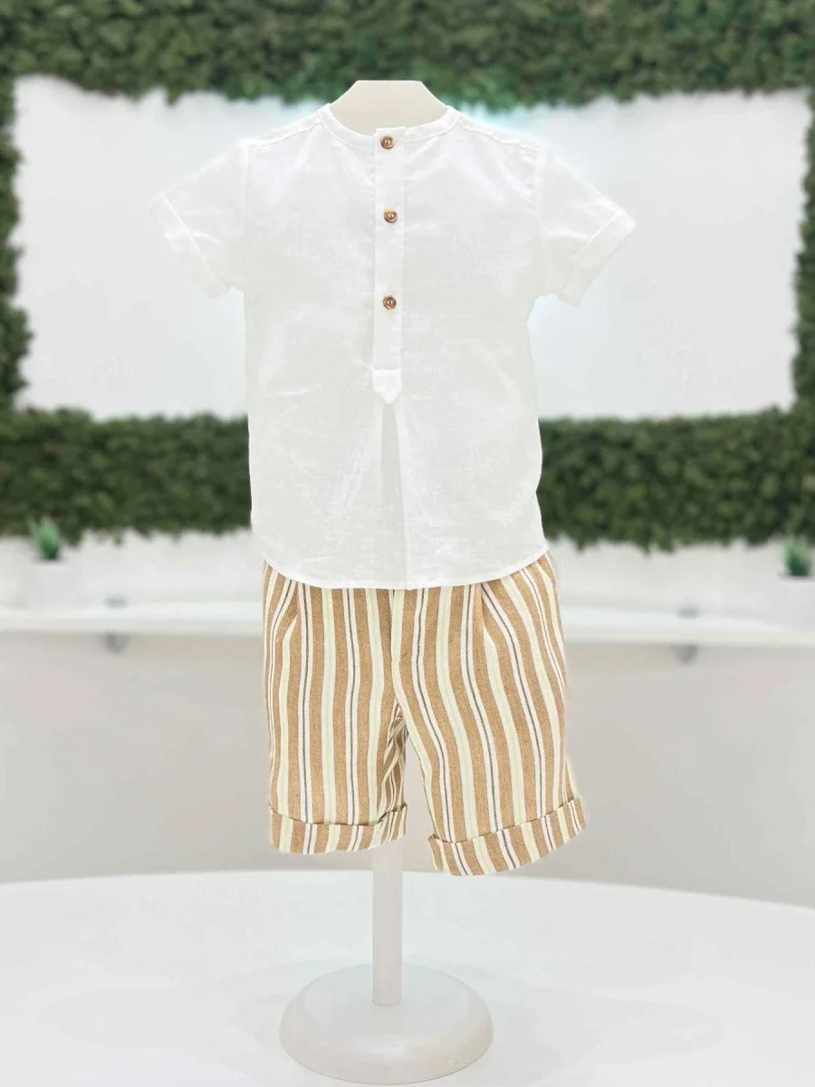 Completo bimbo due pezzi con camicia serafini 100% lino e bermuda a righe 60% lino 40% cotone.