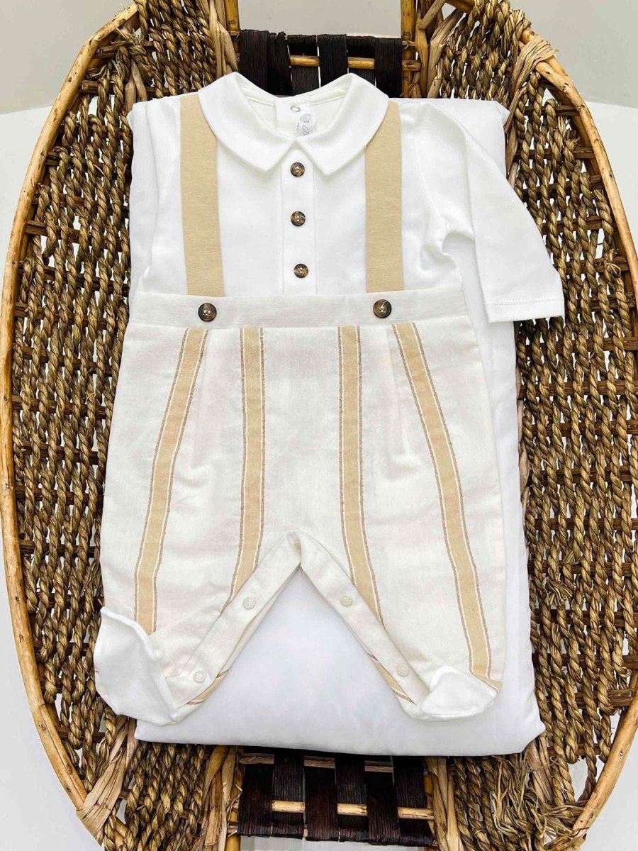 Tutina intera neonato in 100% cotone con trama finta salopette a righe con bretella.