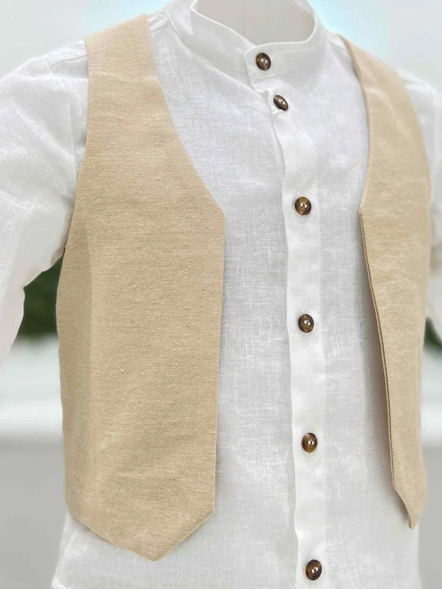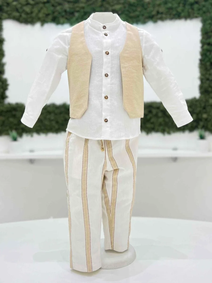 Completo bimbo tre pezzi con camicia manica lunga 100% lino, gilet e pantalone a righe in cotone.
