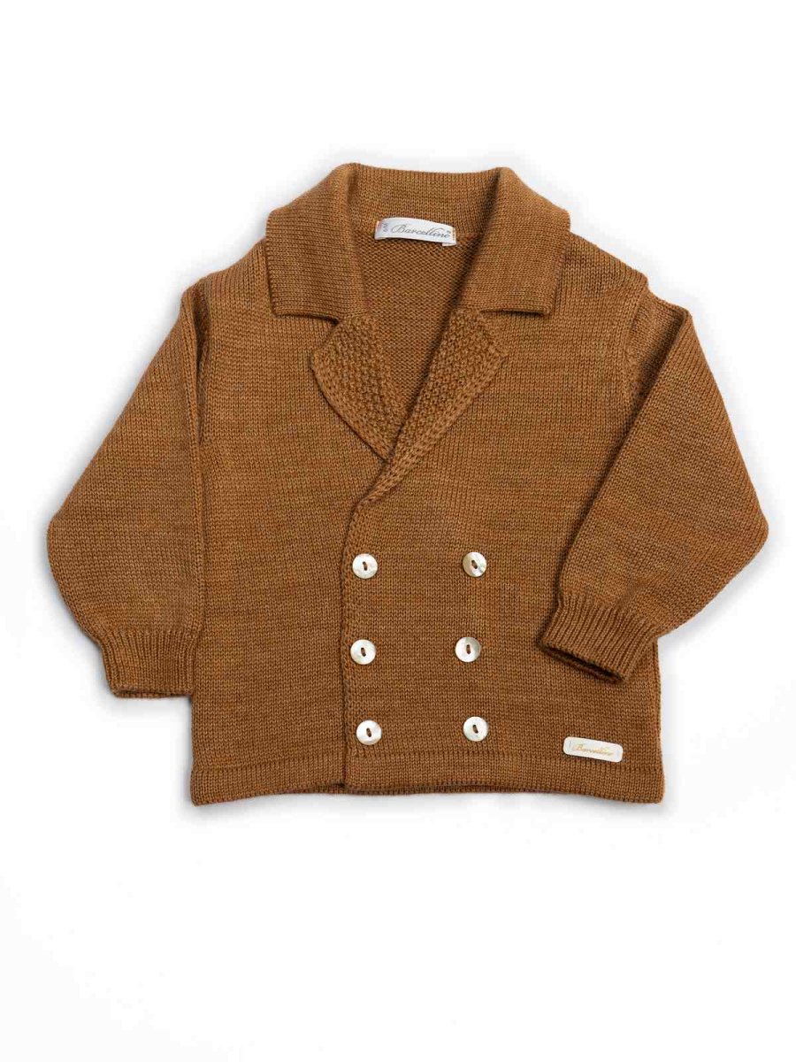 Un cardigan marrone doppiopetto con revers completa l’outfit, fornendo calore e un look sofisticato.