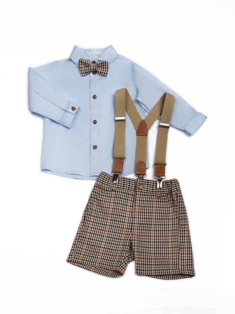 Immagina un completo per bimbo che unisce stile e comfort: una camicia in cotone celeste, leggera e traspirante, con bottoni marroni a contrasto che aggiungono un tocco raffinato. I bermuda check in caldo cotone offrono un’eleganza classica, perfetti per occasioni speciali, abbinato al dettaglio anche il papillon della stessa fantasia.
