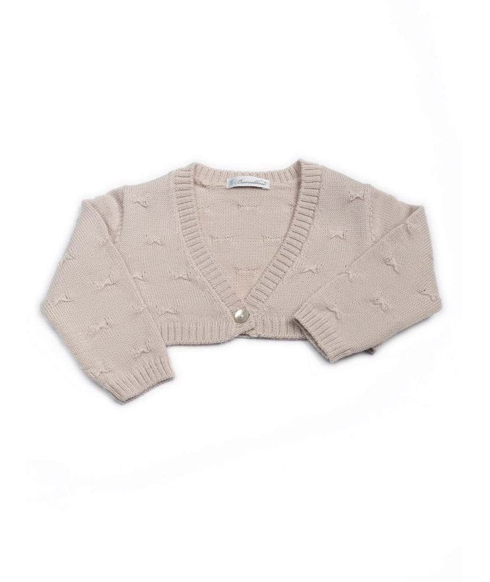 Giacchino in filo panna con abbottonatura frontale. – Polsini e bordo del capo realizzati con lavorazione a costine.
