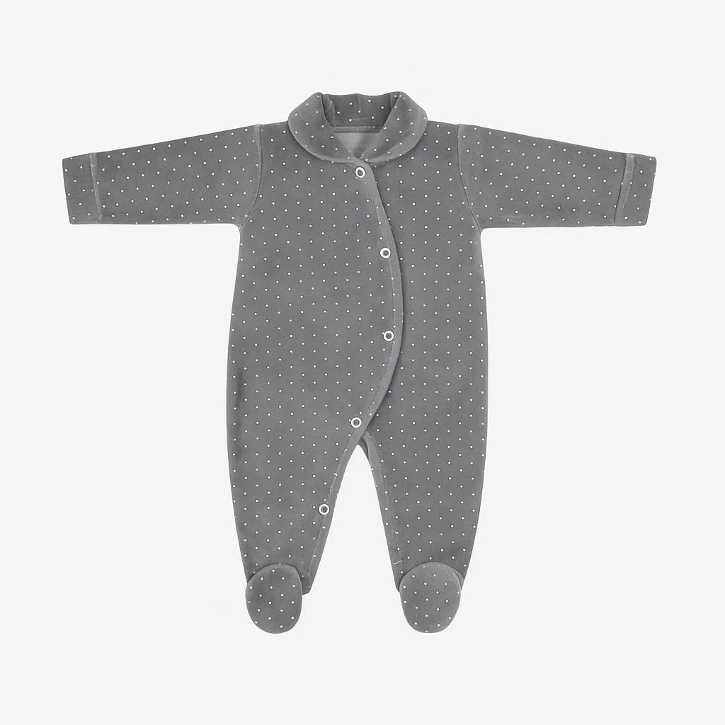 Tutina in ciniglia grigia con micro pois bianchi, collo morbido, maniche lunghe e piedini integrati. Chiusura laterale con bottoni a pressione fino al cavallo.