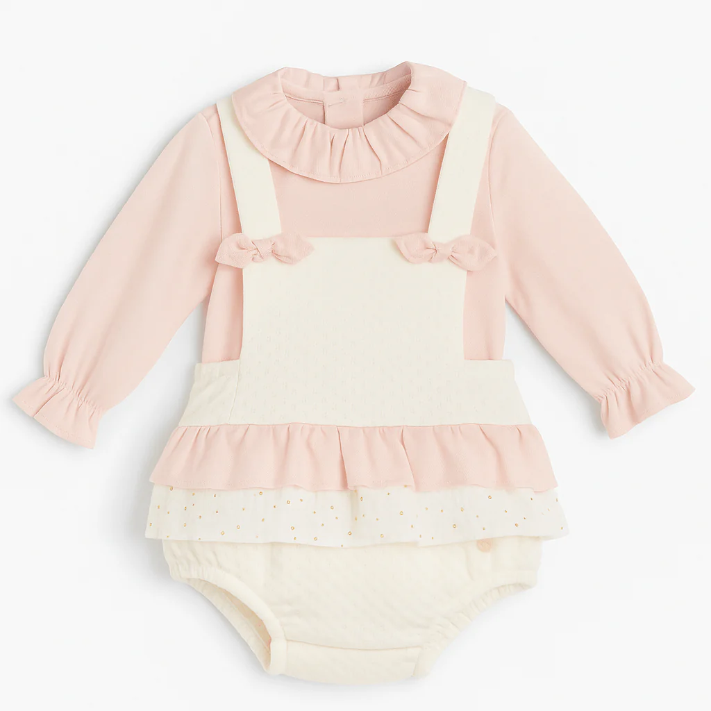 Completo con blusa rosa a manica lunga e colletto arricciato, abbinato a salopette crema con rouches sovrapposte e piccoli fiocchi sul petto. Un ensemble curato nei dettagli, morbido e impeccabile.