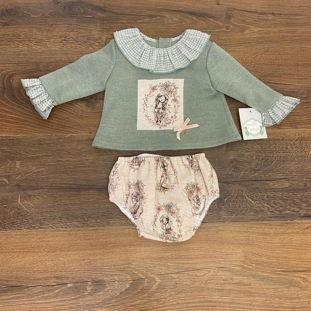 Completo due pezzi con culotte e collo e polsini con rouches.