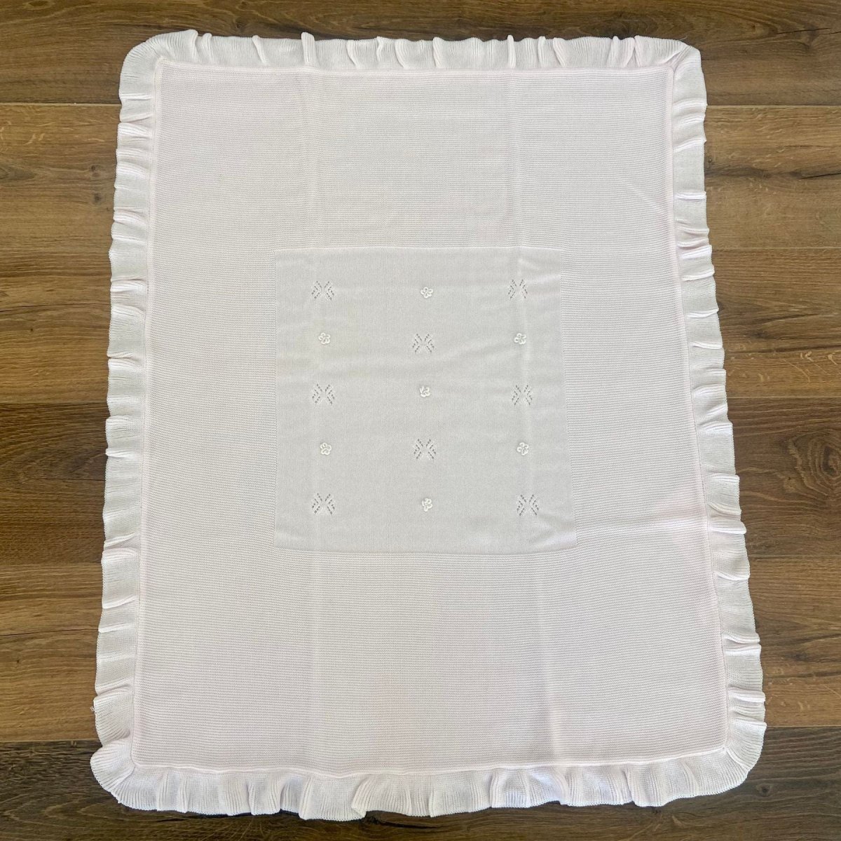 Copertina in filo di cotone, con roselline a vapore e vari trafori.