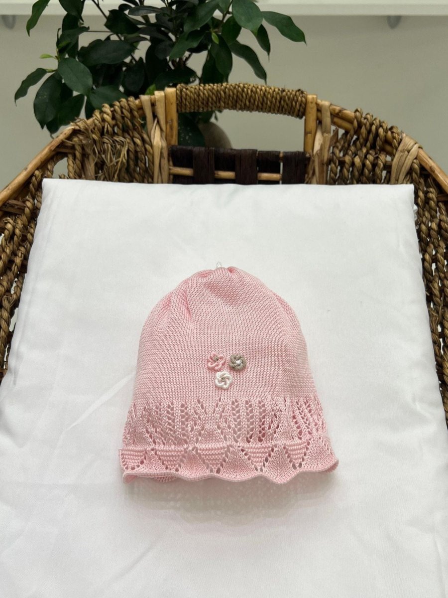 Cappellino in filo di cotone neonata, con dettaglio rose all’uncinetto.