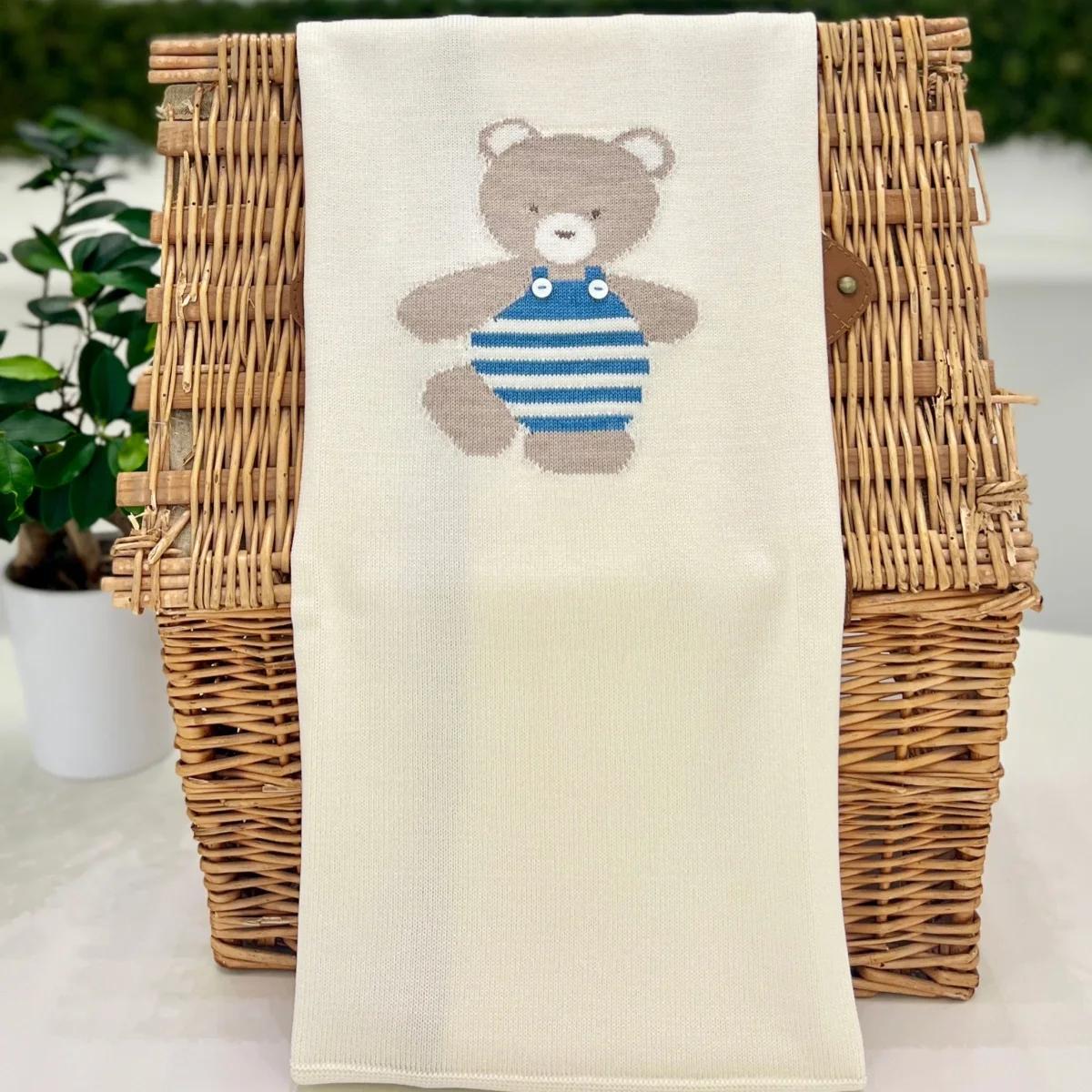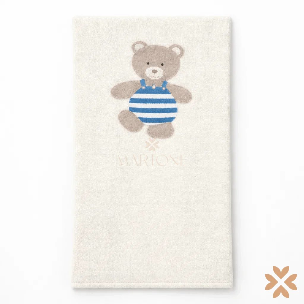Coperta per neonato realizzata in lana merino, rinomata per la sua morbidezza, calore e traspirabilità, ideale per la pelle delicata dei più piccoli. Un dolce orsetto ricamato adorna il centro della coperta, aggiungendo un tocco affettuoso e giocoso al design raffinato. Il ricamo è realizzato con fili di alta qualità, garantendo resistenza e durabilità senza irritare la pelle del neonato.