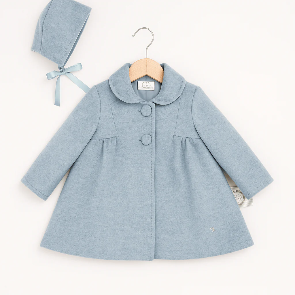 Cappottino celeste dallo stile classico e raffinato, realizzato con linea svasata e dettagli curati. Il modello presenta un colletto arrotondato, due bottoni rivestiti tono su tono sul davanti e leggere arricciature che donano volume alla parte inferiore. È abbinato a una cuffietta coordinata con fiocco in raso, per un look impeccabile nelle occasioni speciali. Un capo elegante e senza tempo, perfetto per la stagione più fredda.