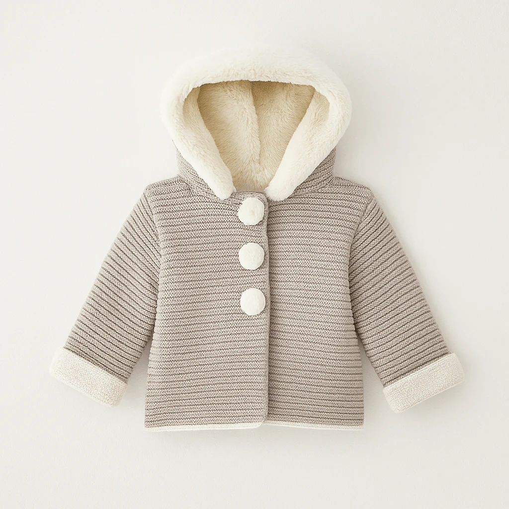 Cappotto in maglia beige con lavorazione a righe, cappuccio foderato in pelliccetta, bottoni rivestiti coordinati e maniche con risvolto.