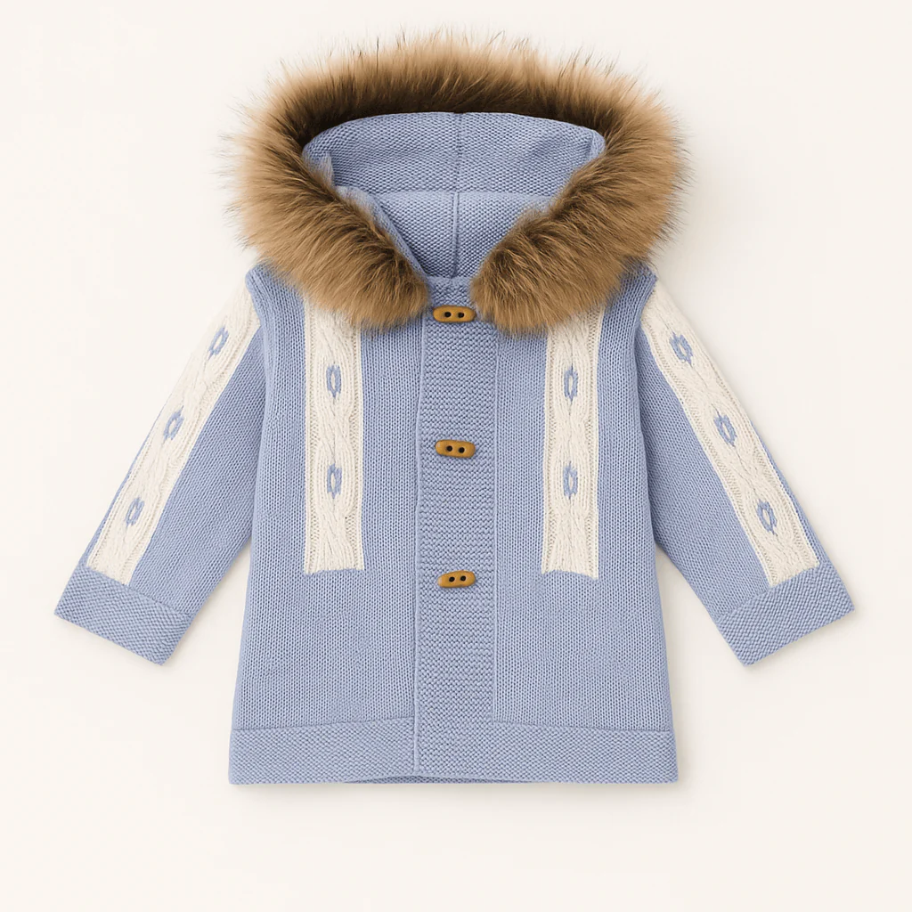 Cappotto in maglia azzurra con pannelli trecciati a contrasto, cappuccio con bordo in ecopelliccia e chiusura frontale con alamari. Maniche lunghe e finiture a coste per una struttura morbida e avvolgente.