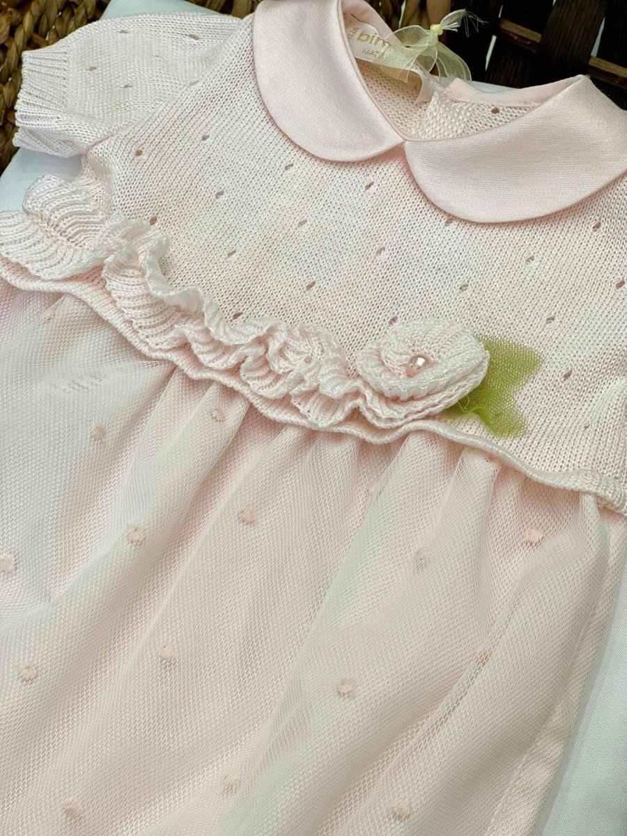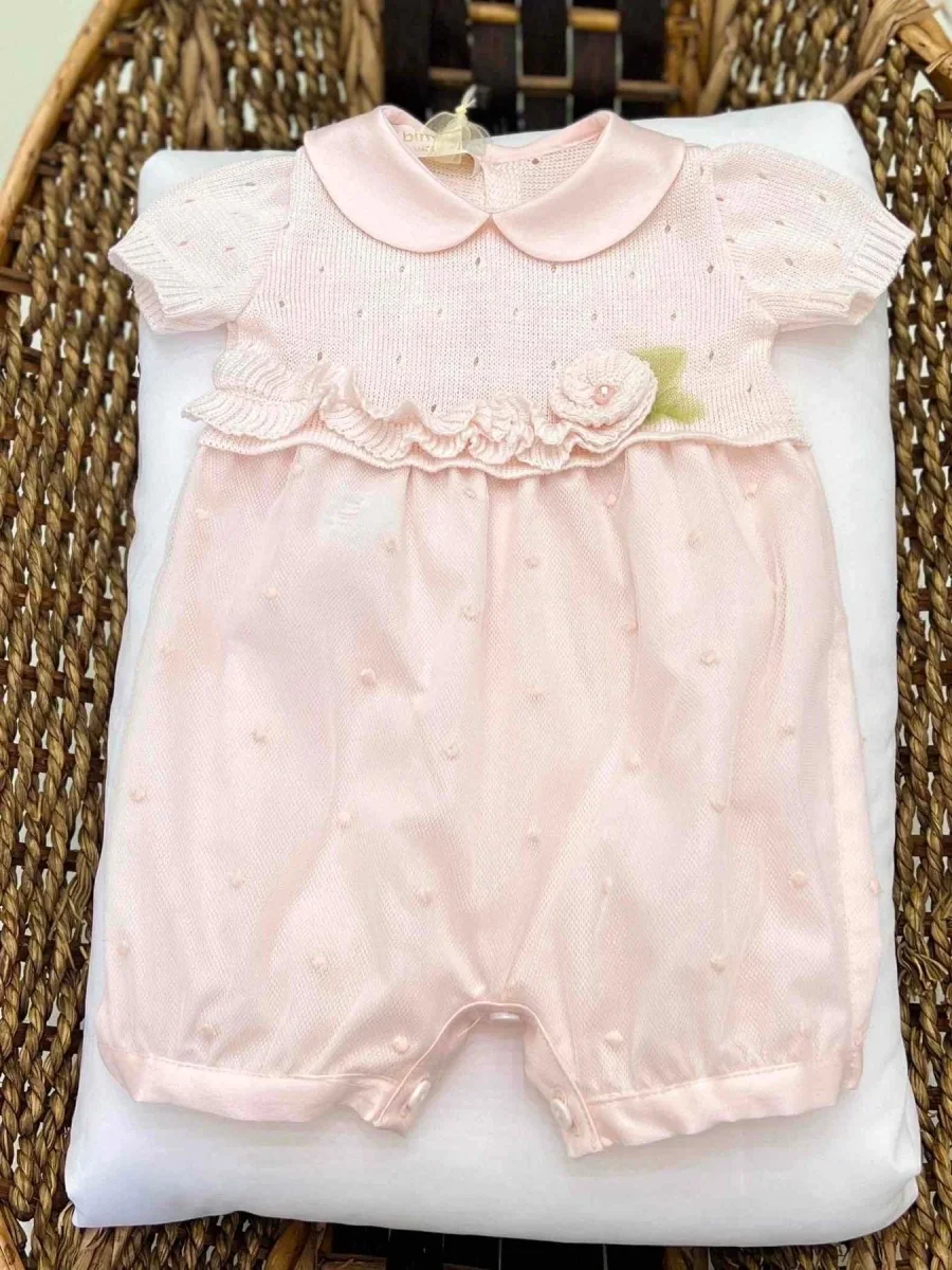 Pagliaccetto neonata manica corta in filo di cotone e plumetis, con colletto in raso, rouches in vita ed applicazioni floreali in filo di cotone.