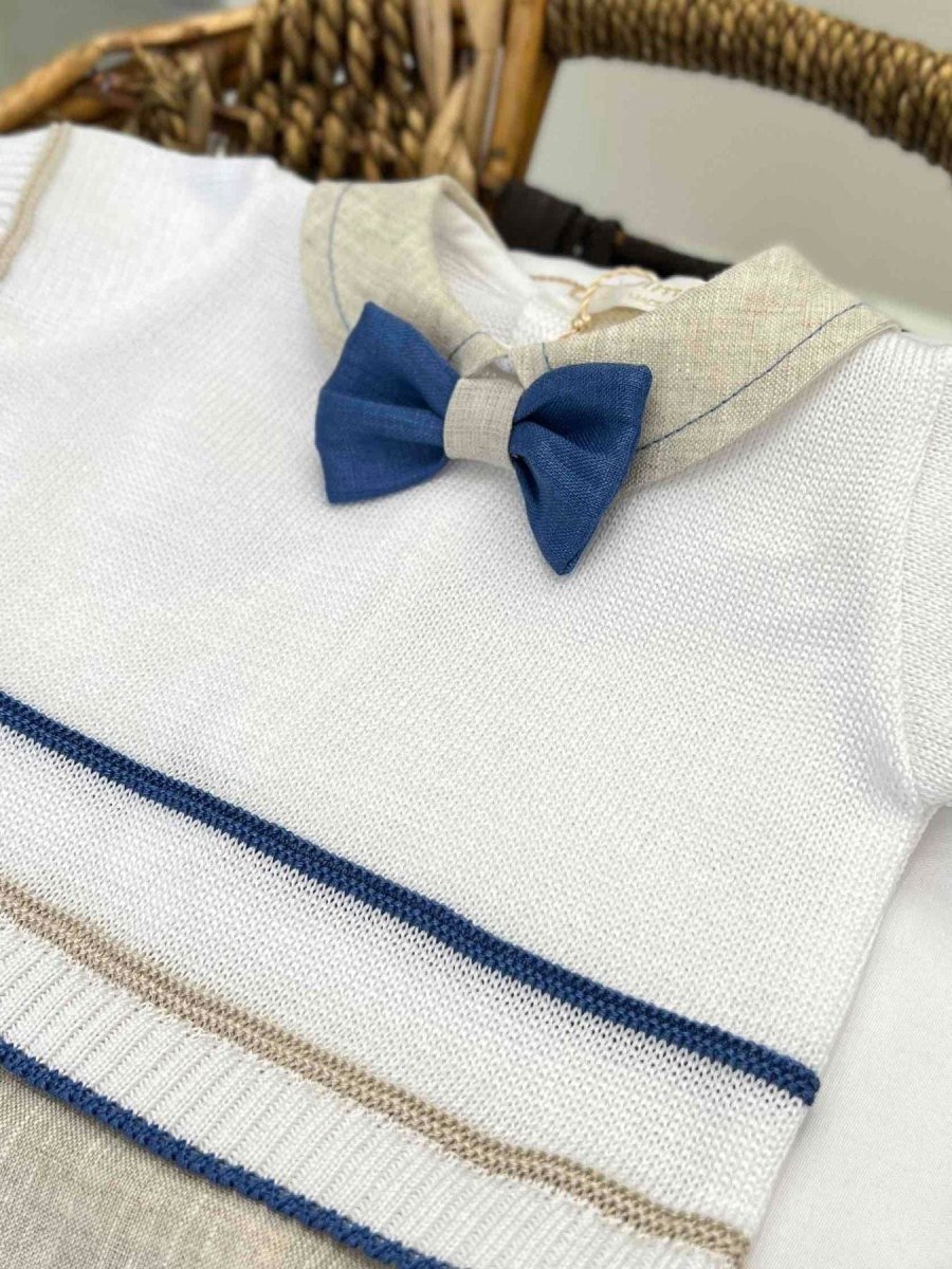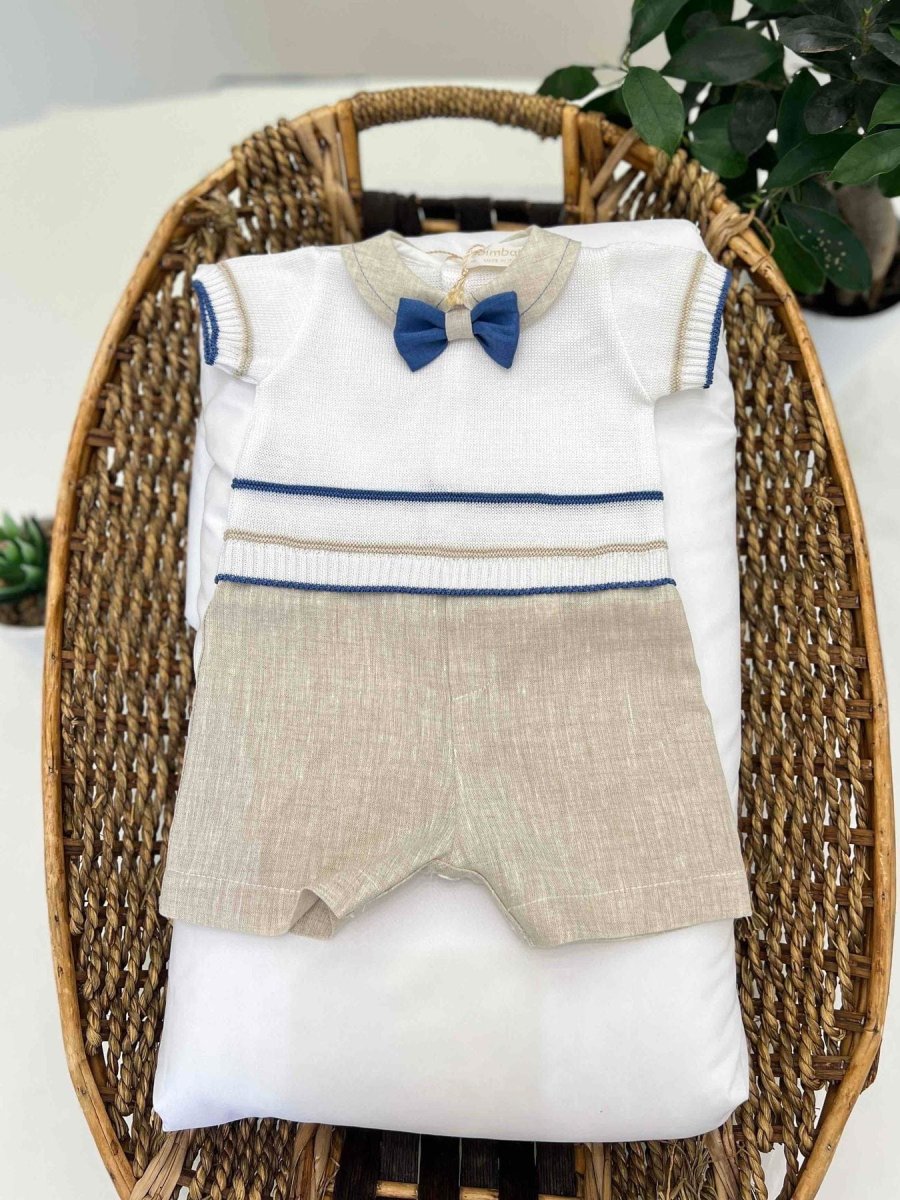 Pagliaccetto neonato manica corta in filo di cotone a righe sopra e bermuda in lino beige sotto. Trama con orsetto.