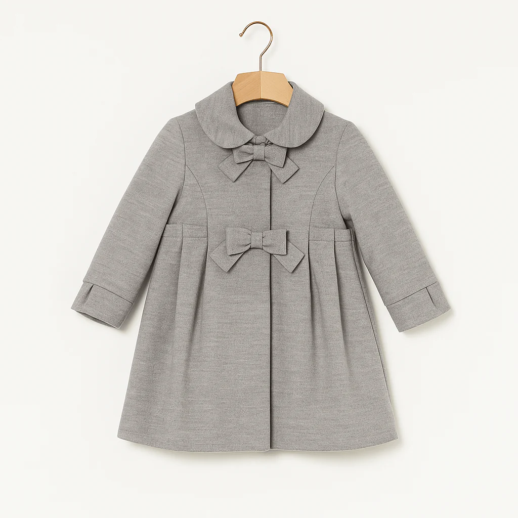 Cappottino grigio dalla linea svasata, impreziosito da due fiocchi applicati sul davanti che aggiungono un tocco delicato e raffinato. Presenta colletto tondo, tagli sartoriali e polsini rifiniti. Un modello elegante ed essenziale, perfetto per completare con classe gli outfit delle occasioni speciali.