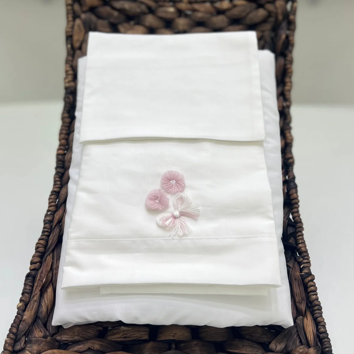 Set lenzuola tre pezzi per culla o navicella in cotone con ricamo in fili di cotone ricamati.