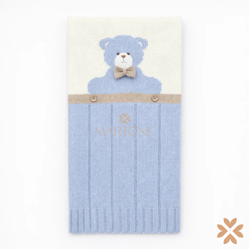 Questa coperta per neonato è realizzata in morbido misto lana con una base color panna e dettagli celesti e beige. Al centro, spicca un adorabile orsetto ricamato in blu chiaro, completo di un piccolo fiocchetto beige al collo, che aggiunge un tocco tenero e giocoso. Nella parte inferiore, una banda celeste con un motivo a coste verticali è arricchita da due bottoni beige, che richiamano i dettagli dell’orsetto. Il design complessivo è dolce e accogliente, perfetto per avvolgere un neonato con comfort e stile.