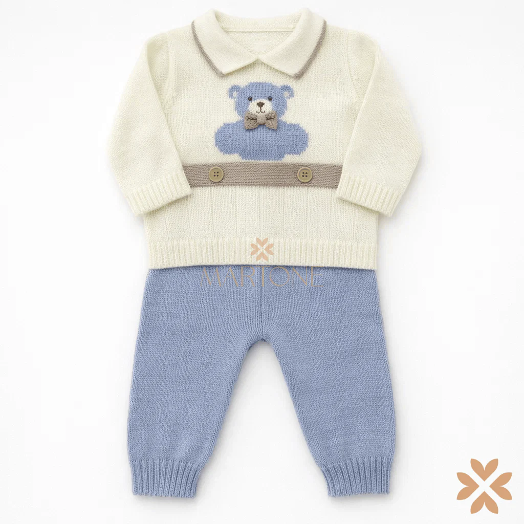 Questa tutina in misto lana per neonato è un delicato completo spezzato. La parte superiore è una maglia color panna con un colletto rotondo e due bottoni decorativi in vita, di colore tortora. Sul davanti è presente un adorabile orsetto celeste ricamato, con un piccolo fiocchetto beige applicato sul petto. I pantaloni, coordinati, sono di un tenue colore celeste e completano il look in modo armonioso.