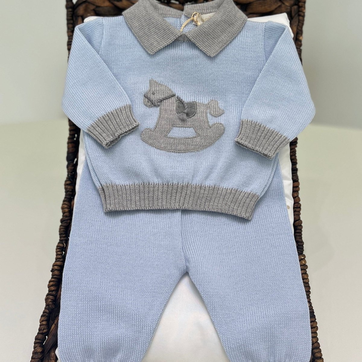 Una tutina intera per neonato in misto lana color celeste cielo, con contrasto in grigio. Sul petto è ricamato un cavallo a dondolo. I bottoni, color tortora, si trovano sul retro della maglia, per un cambio facilitato.