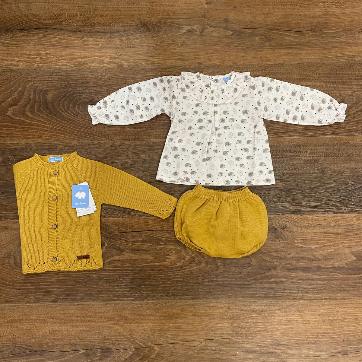 Completo tre pezzi con maglietta con collo con rouches,cardigan e culotte .