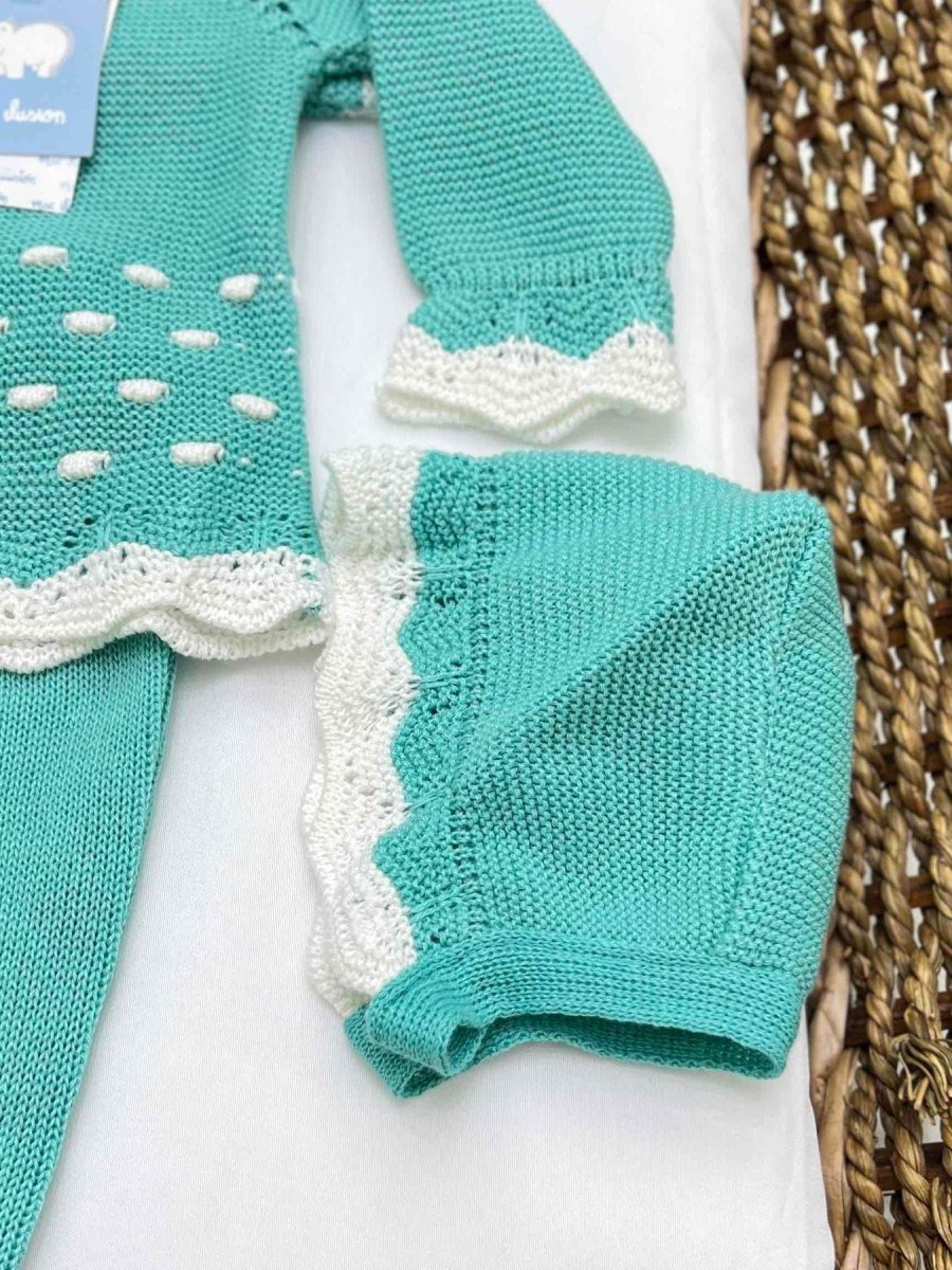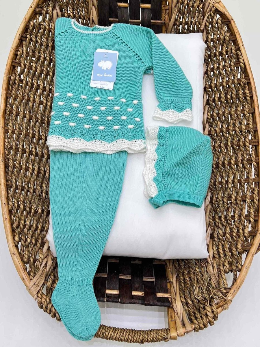 Completo nascita neonata tre pezzi con ghettine e cuffia in filo di cotone, con trama traforata e rouches bianche.