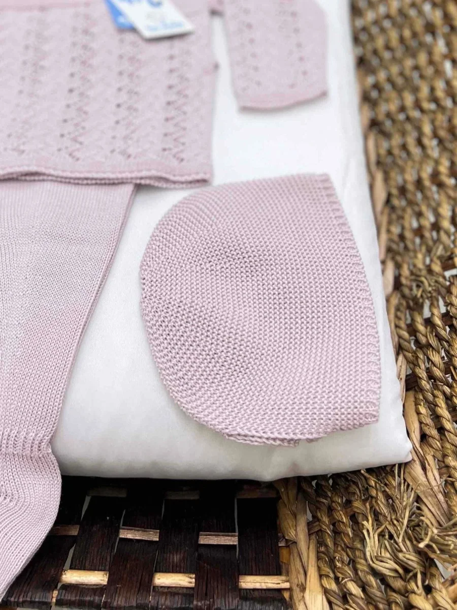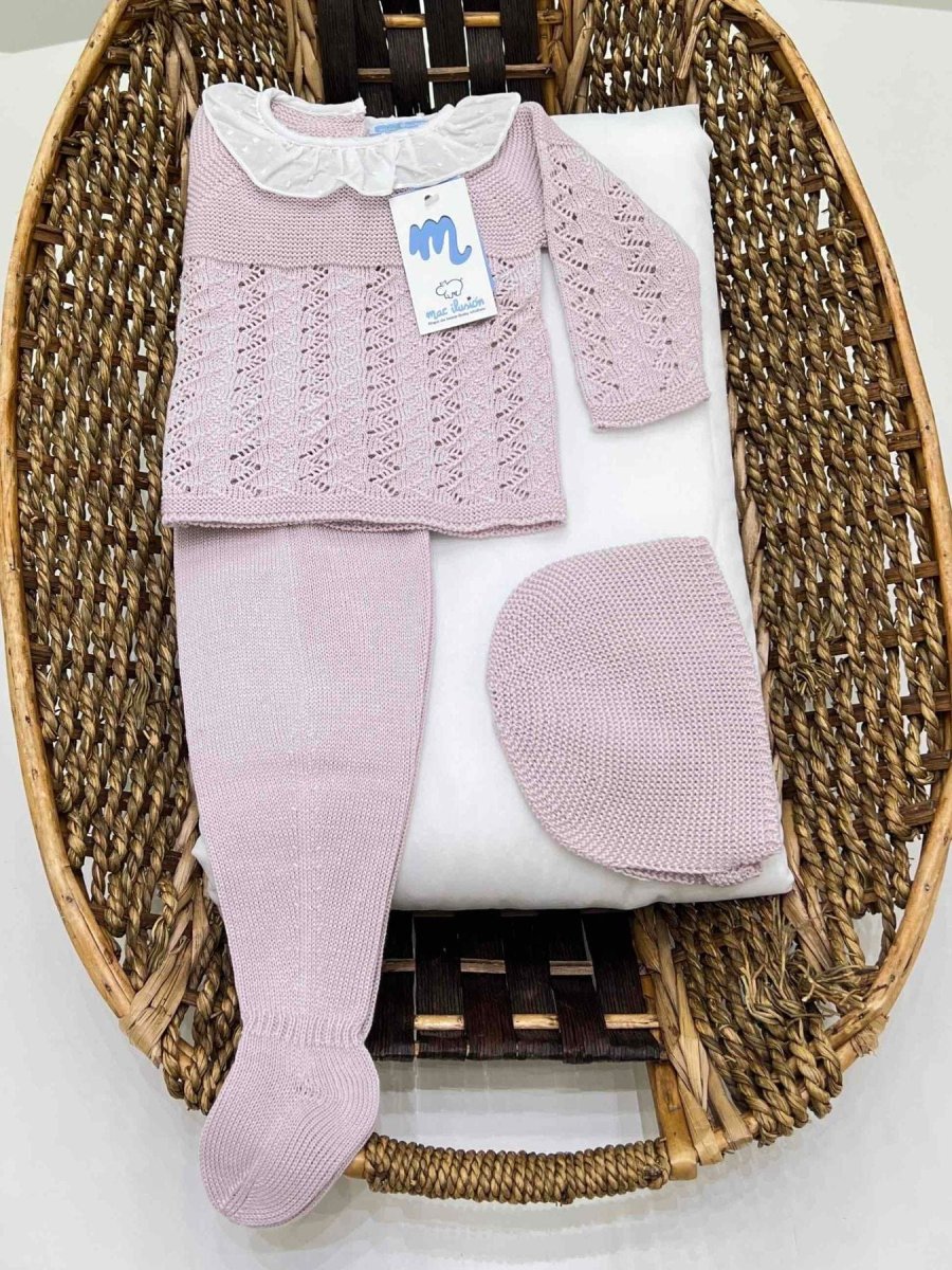 Completo nascita neonata tre pezzi con ghettine e cuffia in filo di cotone, con colletto in plumetis e trama traforata.