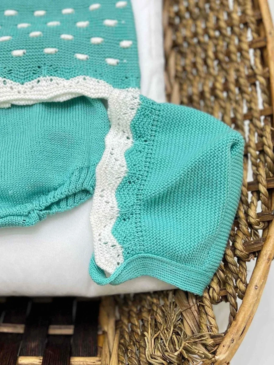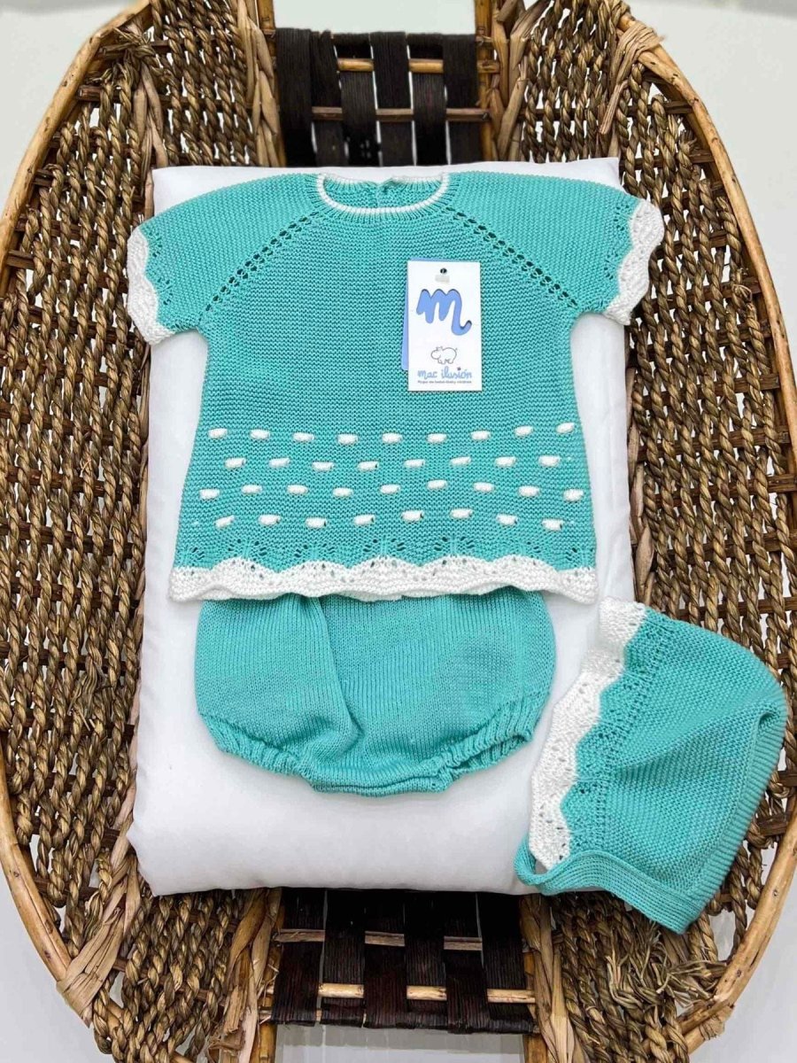 Completo neonata tre pezzi con coulotte e cuffia in filo di cotone e trama ricamata con smerlo bianco traforato.