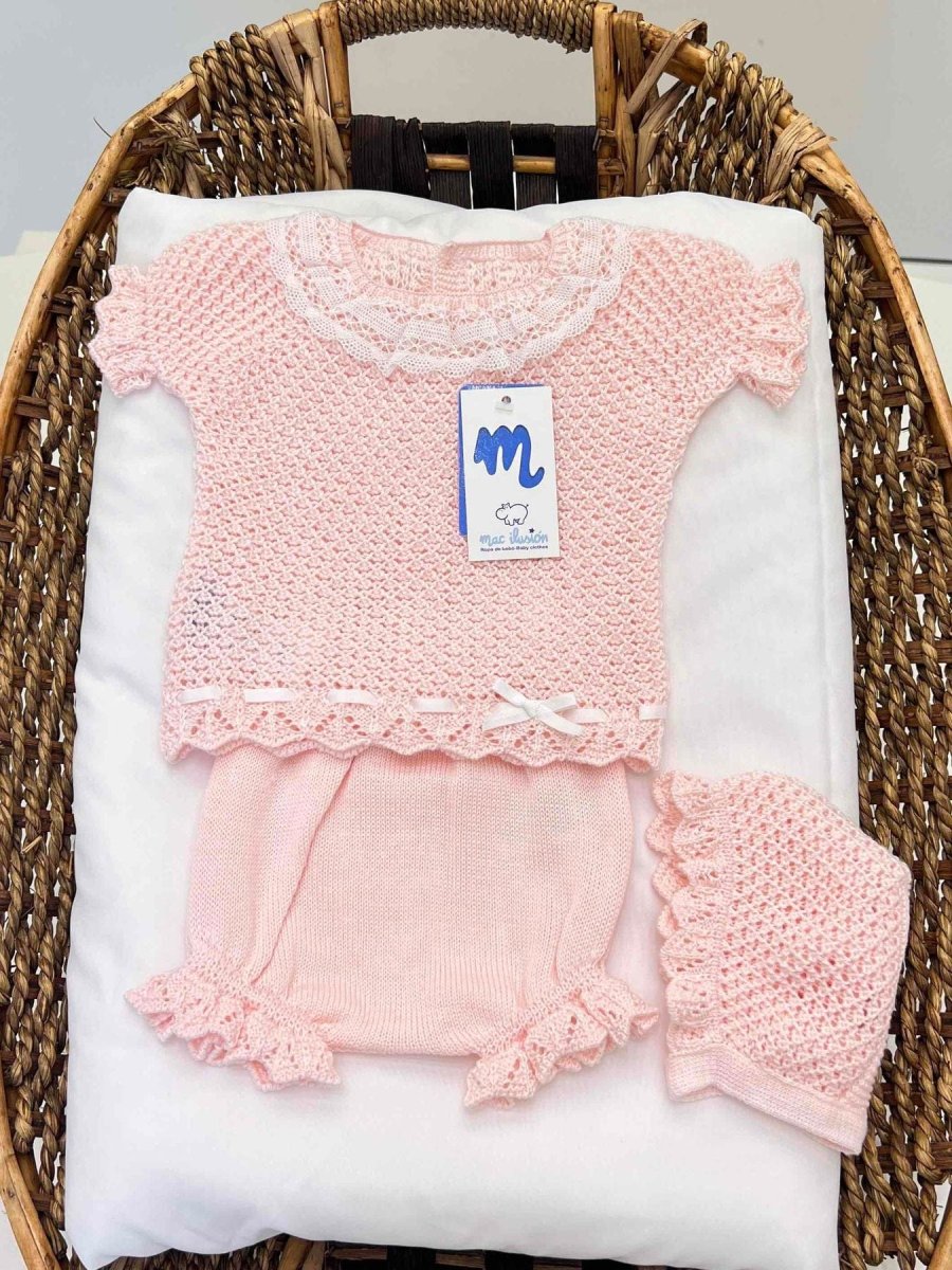 Completo tre pezzi neonata in filo di cotone a manica corta con culotte e cuffia.