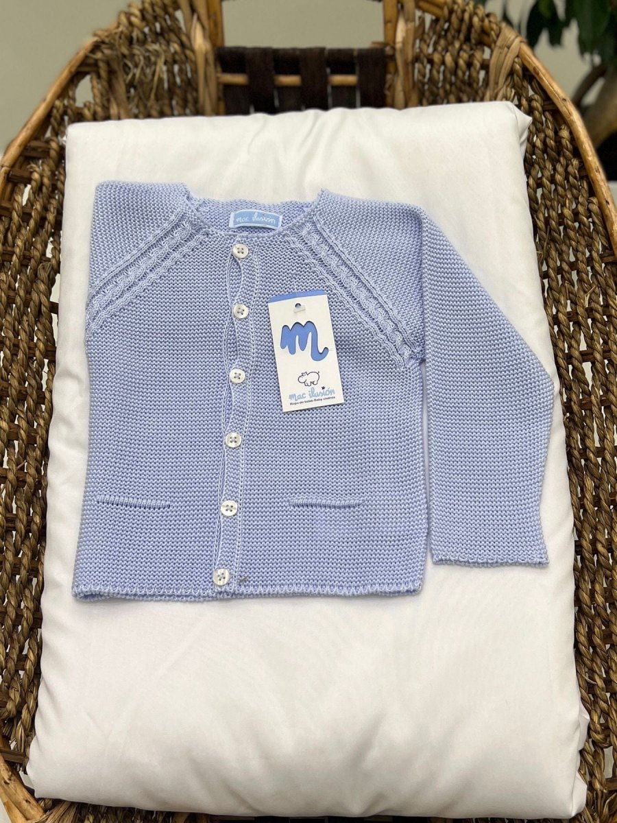 Cardigan bimbo azzurro in filo di cotone con trama ricamata.