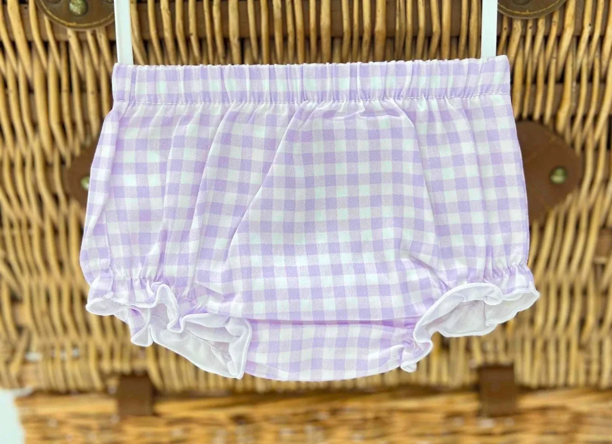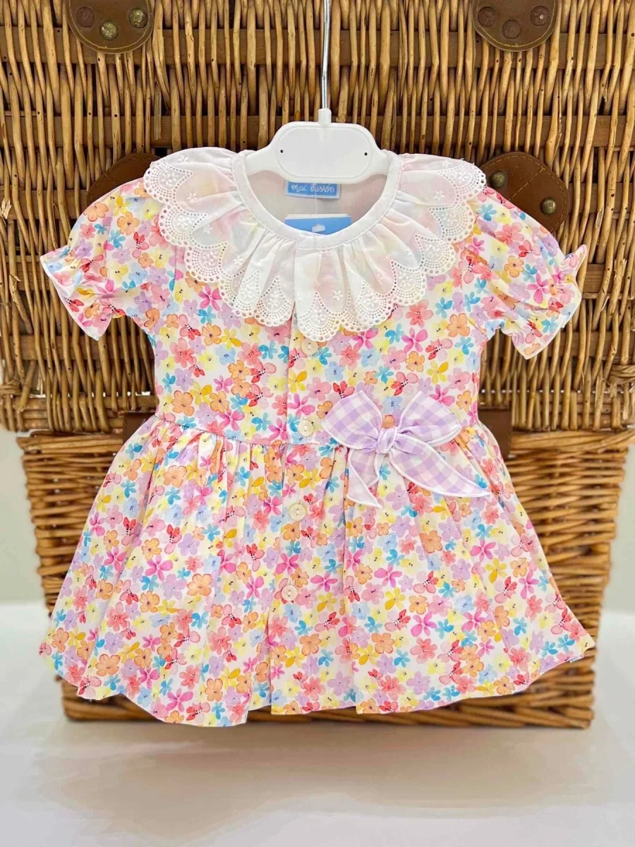 Vestito bimba in cotone con fantasia floreale, culotte vichy e colletto in sangallo.
