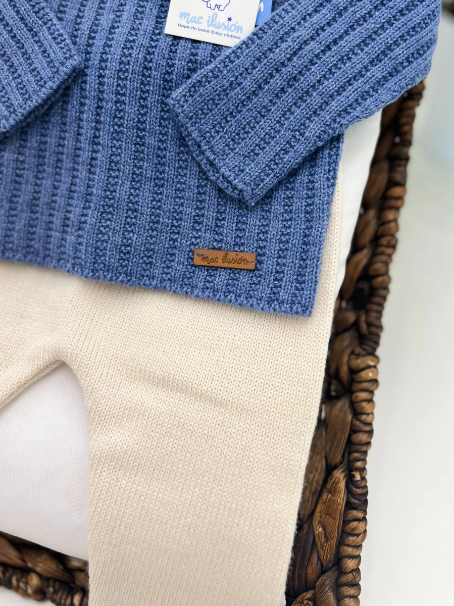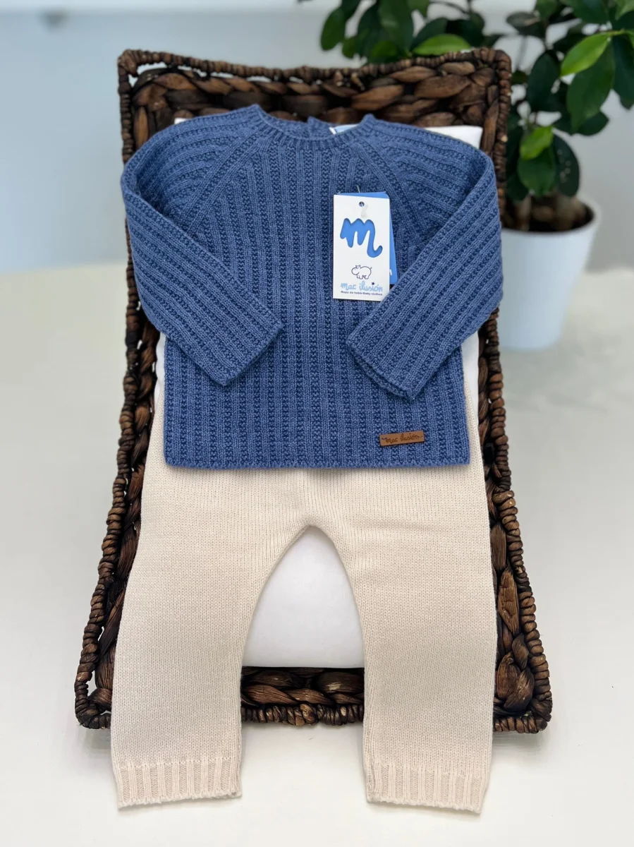 Questo completo due pezzi per bimbo è realizzato in un caldo misto lana, perfetto per le giornate fresche. Il maglione blu presenta un design classico e accogliente, con una lavorazione a maglia che garantisce morbidezza e comfort. I pantaloni écru , anch’essi in misto lana, sono dotati di lacci regolabili in vita per una vestibilità personalizzata e sicura. Questo completo combina praticità e stile, assicurando al tuo bimbo un look elegante e un comfort ottimale.