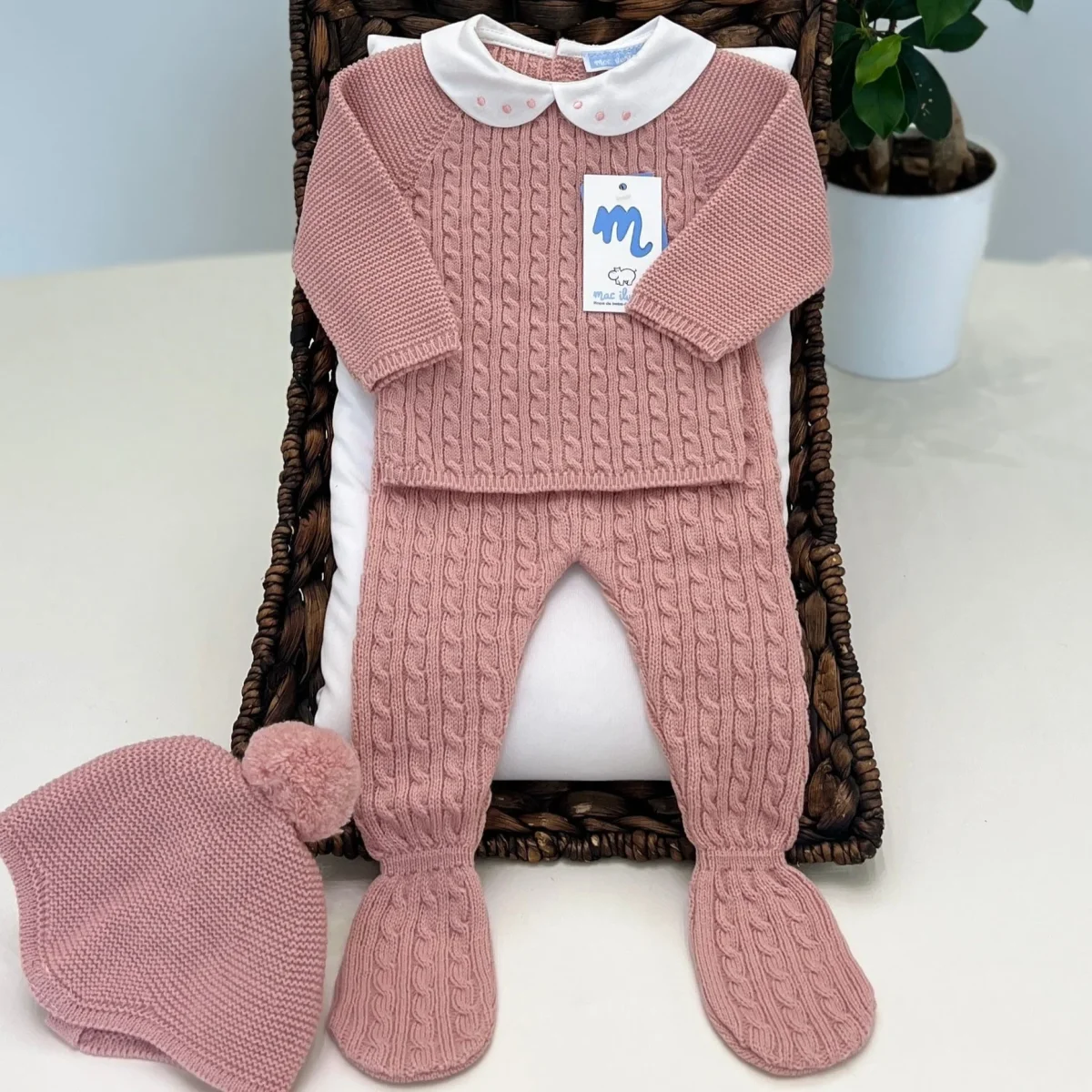 La lavorazione a trecce conferisce un aspetto elegante e raffinato. La maglia ha un’abbottonatura sul retro per facilitare il cambio della bambina ed un collo rotondo arricchito da un delicato ricamo. Il completo include anche delle ghettine abbinate e un cappellino coordinato, creando un ensemble perfetto per il comfort e lo stile del neonato.