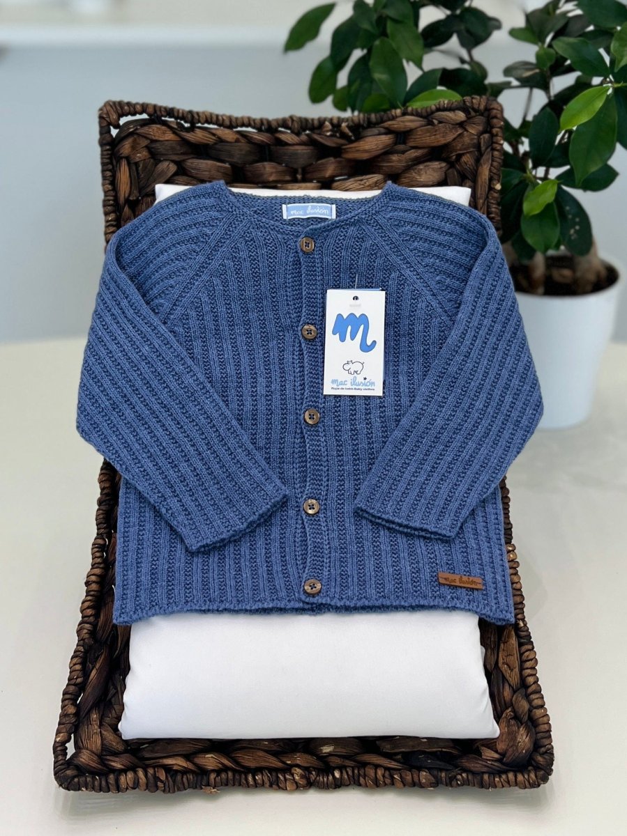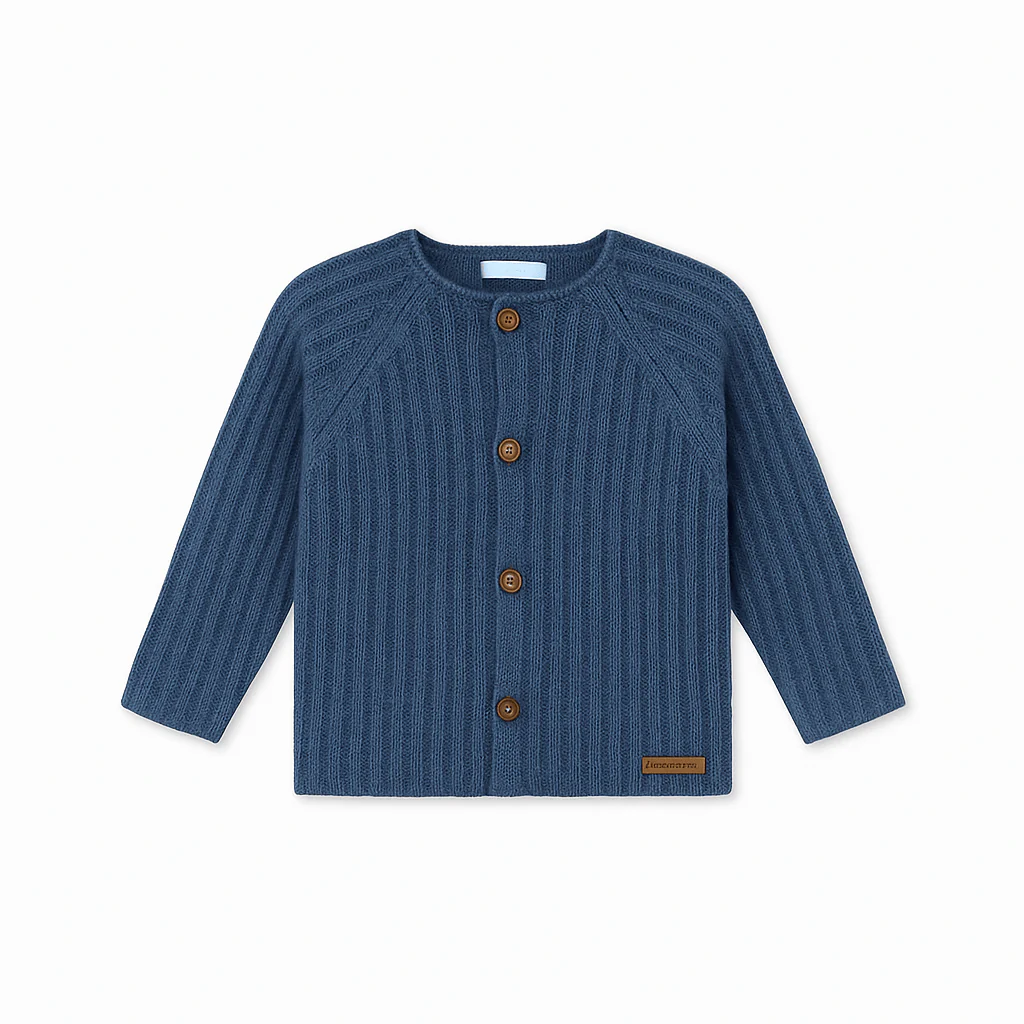 Cardigan bimbo realizzato in una soffice maglia misto lana, che garantisce calore e comfort. Il colore blu avio conferisce un aspetto fresco e moderno. Il cardigan è arricchito da bottoncini marroni che creano un elegante contrasto con il colore predominante, aggiungendo un tocco di raffinatezza al design.