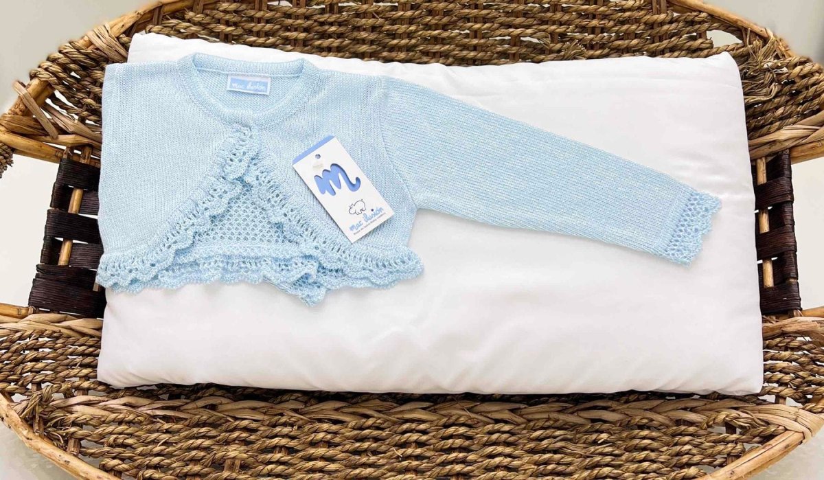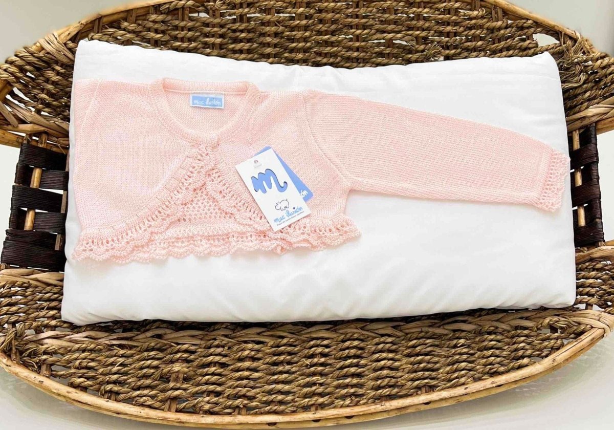 Cardigan bimba stondato con smerlo in filo di cotone traforato.