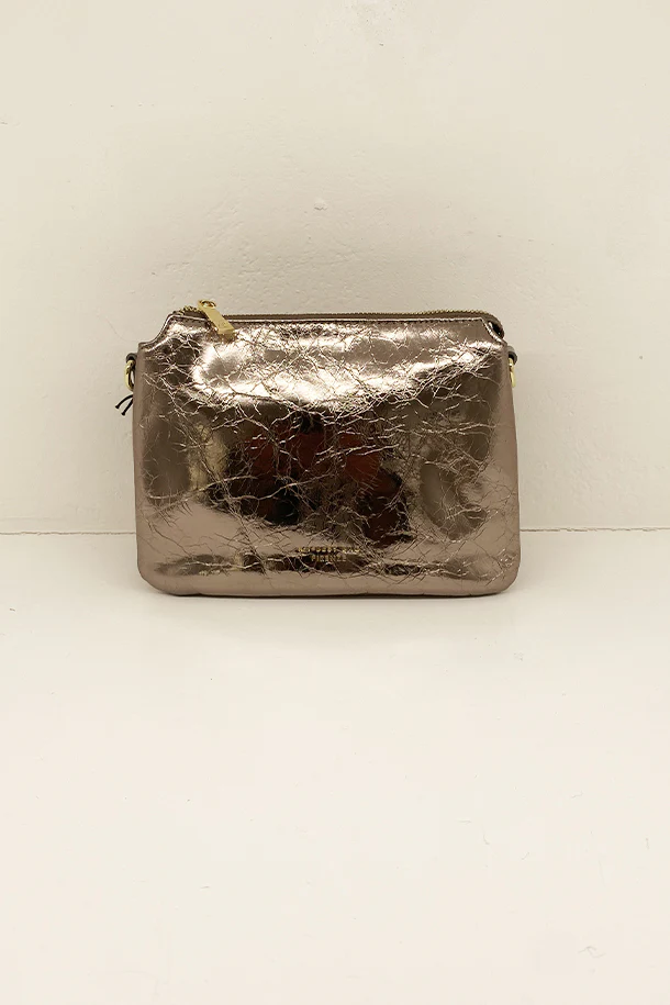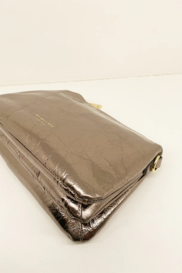 Borsa a mano in pelle laminata con doppio soffietto, tracolla removibile in tinta, chiusura con zip, logo stampato, interno foderato con scomparti