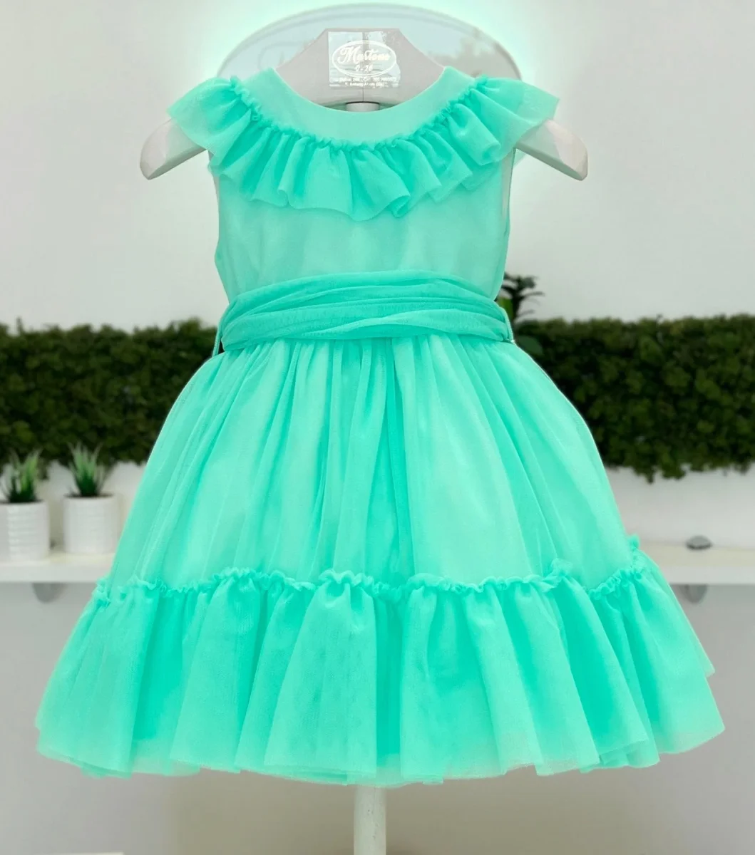 Abito bimba in tulle a balze con con volant e fiocco sul retro.