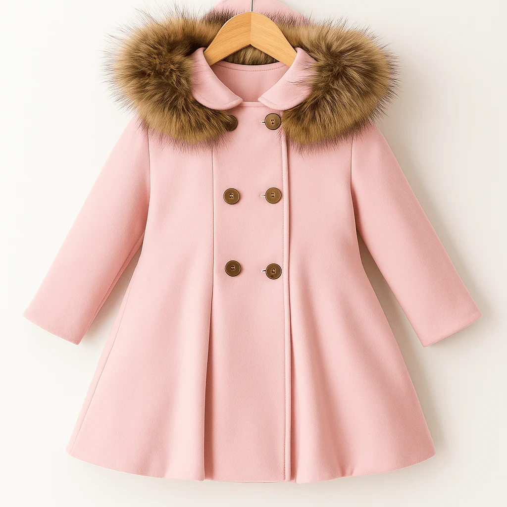 Cappottino rosa doppiopetto dalla linea svasata, impreziosito da un ampio cappuccio rifinito in morbidissima ecopelliccia. I bottoni tono legno aggiungono un tocco caldo e sofisticato al design essenziale. Un modello elegante, avvolgente e ideale per un look impeccabile nelle giornate più fredde.