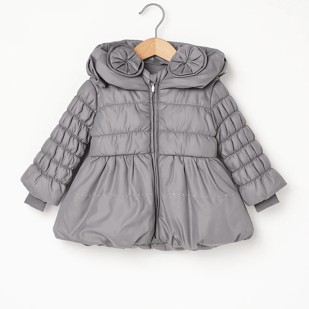 Piumino grigio dalla linea morbida, con cappuccio decorato da due maxi applicazioni a fiocco che aggiungono un tocco romantico. Le maniche presentano una lavorazione arricciata che dona volume, mentre la parte inferiore è leggermente sagomata e rifinita con una fila di piccoli strass. Chiusura con zip frontale. Un modello caldo e delicato, perfetto per un look invernale elegante.