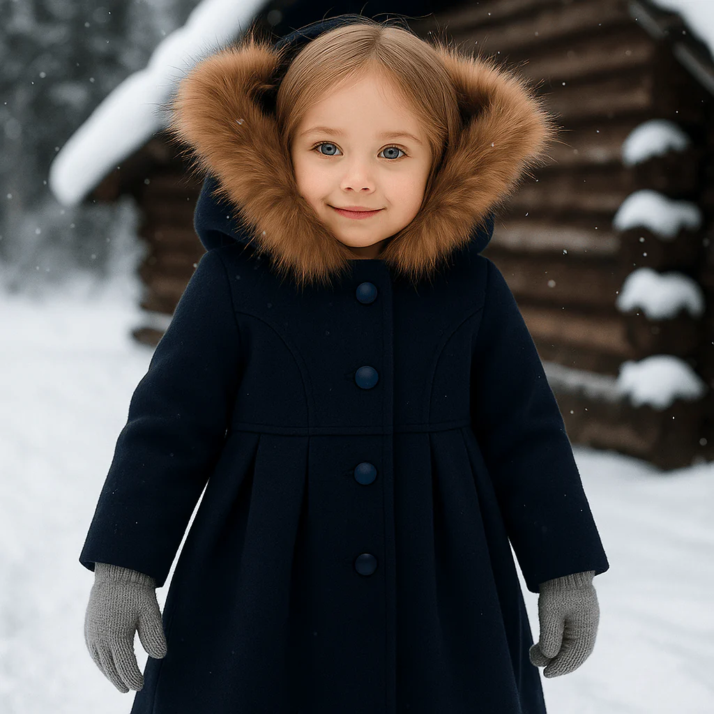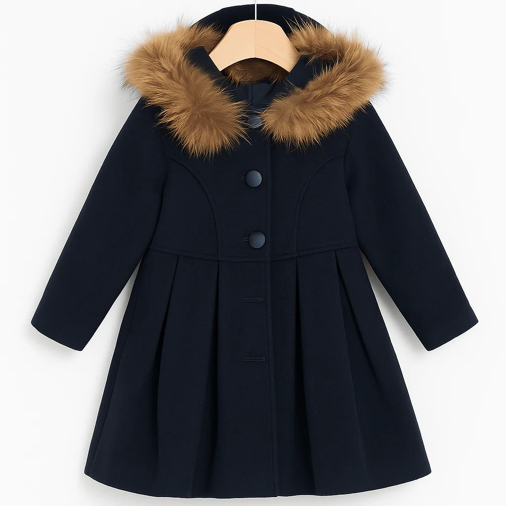 Cappottino blu dal taglio elegante, caratterizzato da una linea svasata con pieghe e cappuccio rifinito in morbida ecopelliccia color miele. I bottoni tono su tono completano il design essenziale e raffinato. Un modello caldo e impeccabile, ideale per un look sofisticato nelle giornate fredde.
