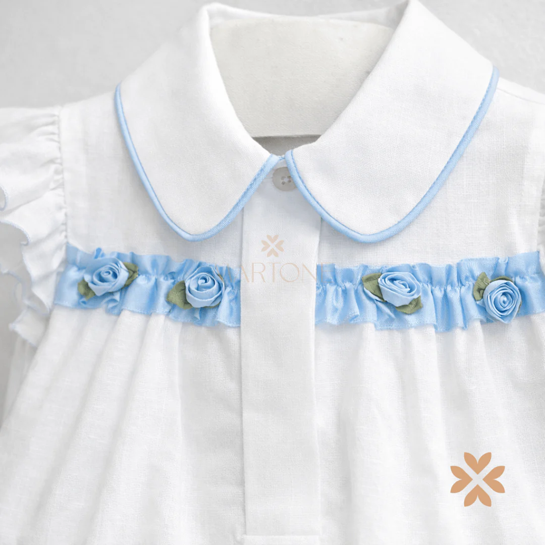 Abito da cerimonia in lino bianco con colletto tondo rifinito da profilo azzurro e maniche con ruches. Linea svasata con balza sul fondo e dettagli decorativi sul davanti con roselline applicate e inserti in contrasto. Vestibilità comoda e struttura leggera, ideale per occasioni speciali.