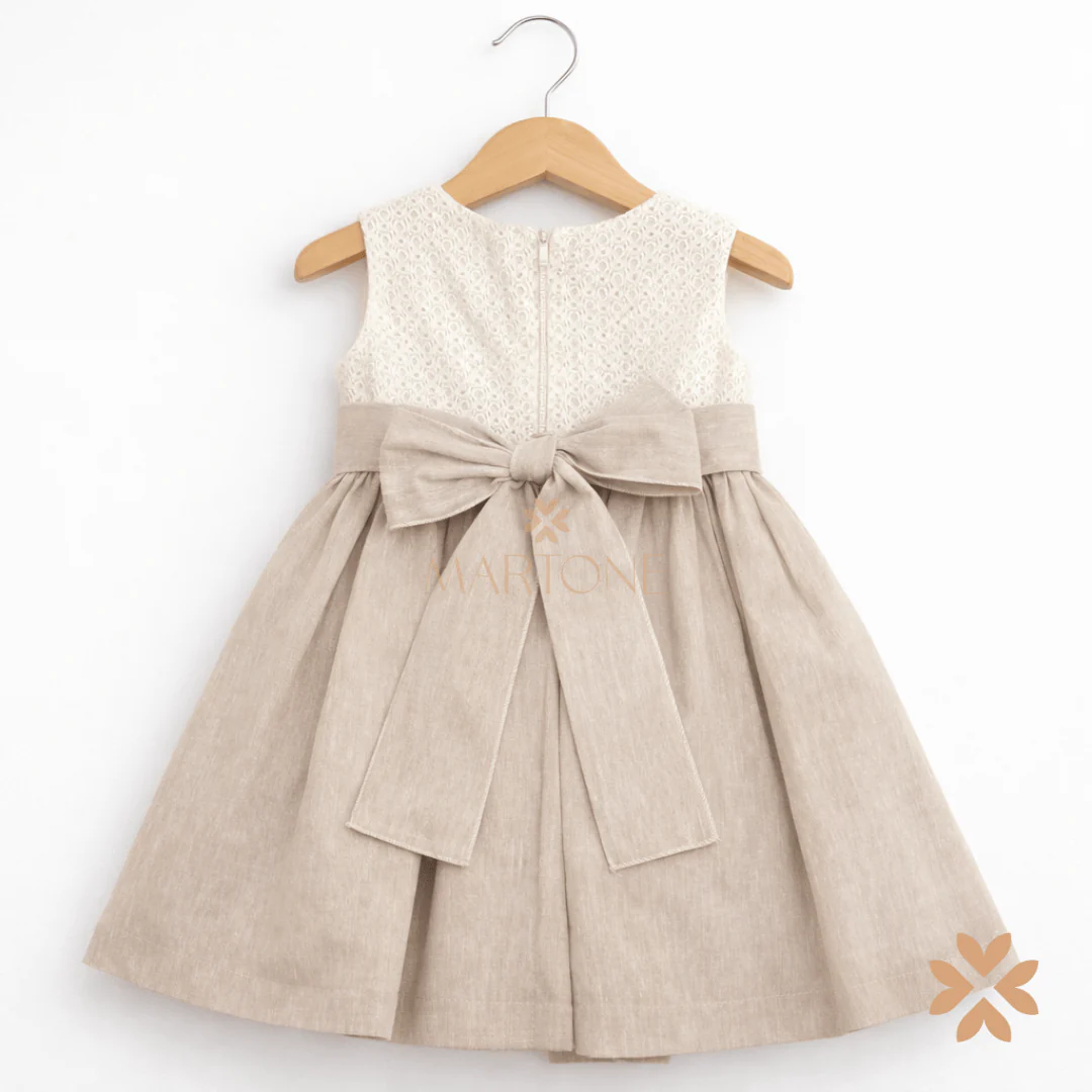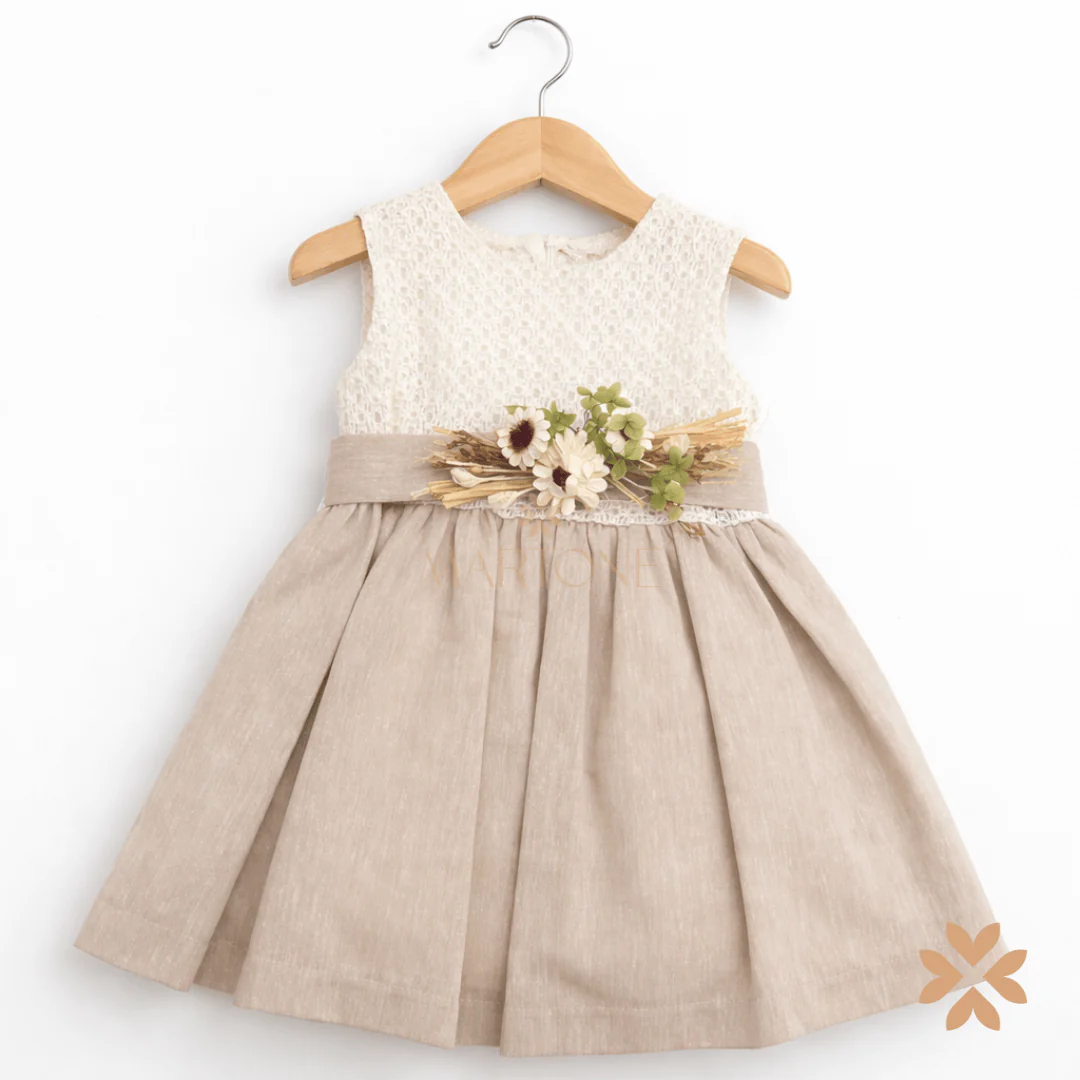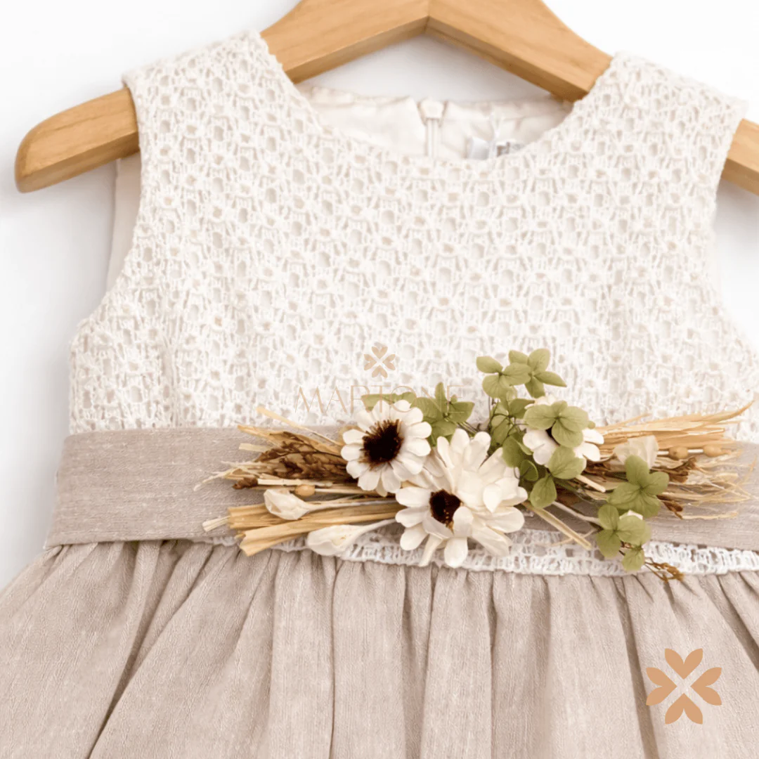 Abito da cerimonia per bimba con corpino in pizzo macramè tono avorio, scollo tondo e chiusura posteriore con zip invisibile. Fascia in vita in tessuto naturale con fiocco strutturato sul retro oppure applicazione floreale decorativa sul davanti. Gonna ampia in tessuto effetto lino con pieghe morbide che donano volume e movimento. Interno foderato per una vestibilità confortevole.