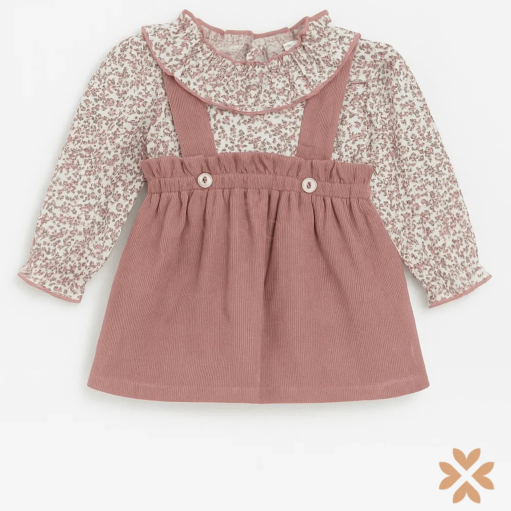 Completo bimba composto da camicia in cotone con stampa floreale e colletto tondo abbinata a salopette in velluto a costine color rosa antico. Un insieme raffinato e confortevole, perfetto per le prime uscite o per un’occasione speciale.